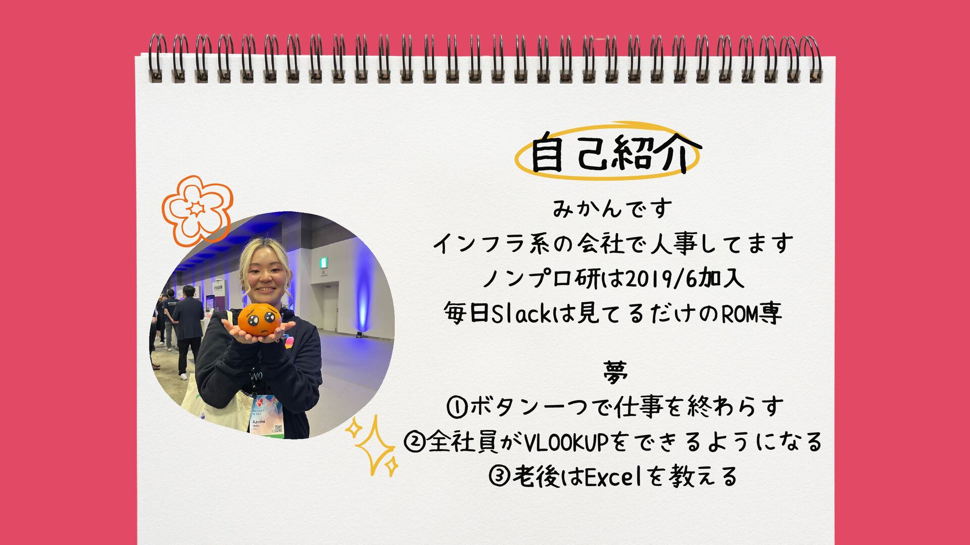 自己紹介 みかんです インフラ系の会社で人事してます ノンプロ研は2019/6加入 毎日Slackは見てるだけのROM専 夢 ①ボタン一つで仕事を終わらす ②全社員がVLOOKUPをできるようになる ③老後はExcelを教える