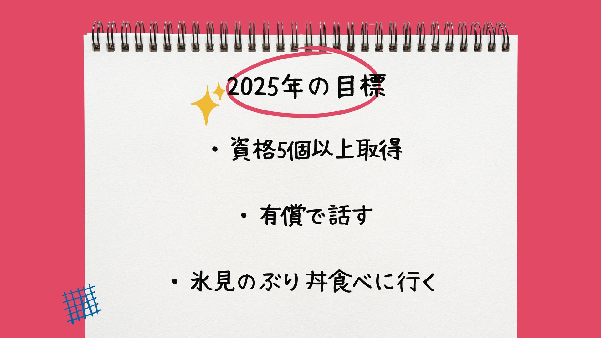 ・資格5個以上取得 ・有償で話す ・氷見のぶり丼食べに行く 2025年の目標