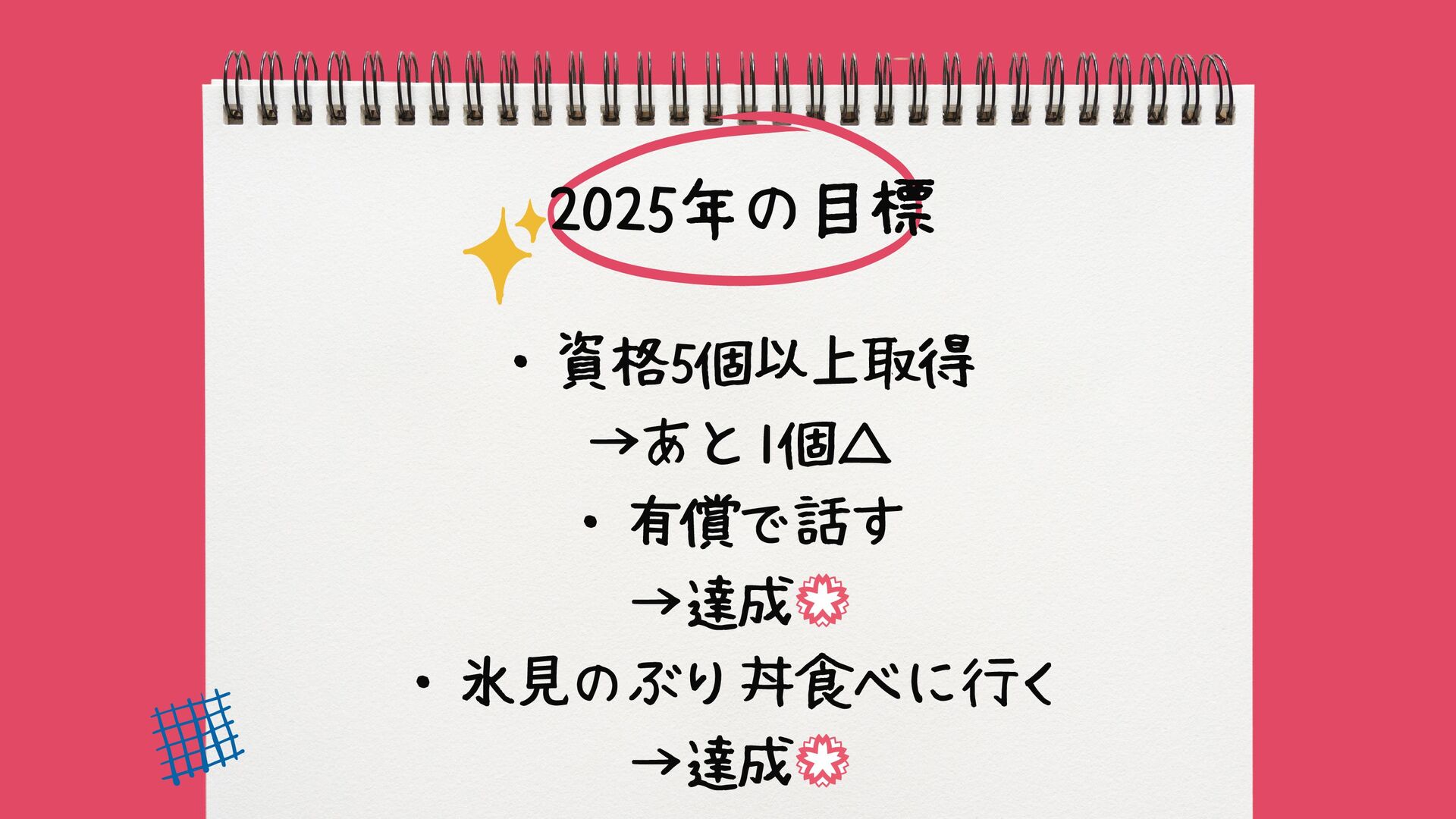 ・資格5個以上取得 →あと1個△ ・有償で話す →達成 💮 ・氷見のぶり丼食べに行く →達成 💮 2025年の目標