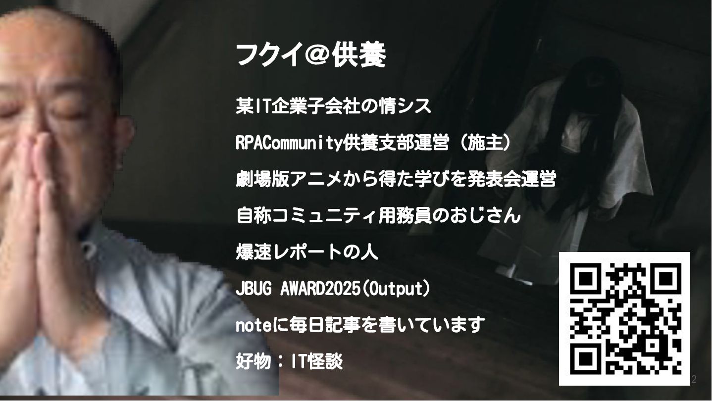 フクイ@供養 某IT企業子会社の情シス RPACommunity供養支部運営(施主) 劇場版アニメから得た学びを発表会運営 自称コミュニティ用務員のおじさん 爆速レポートの人 JBUG AWARD2025(Output) noteに毎日記事を書いています 好物:IT怪談