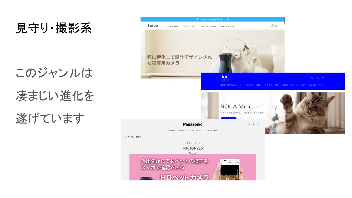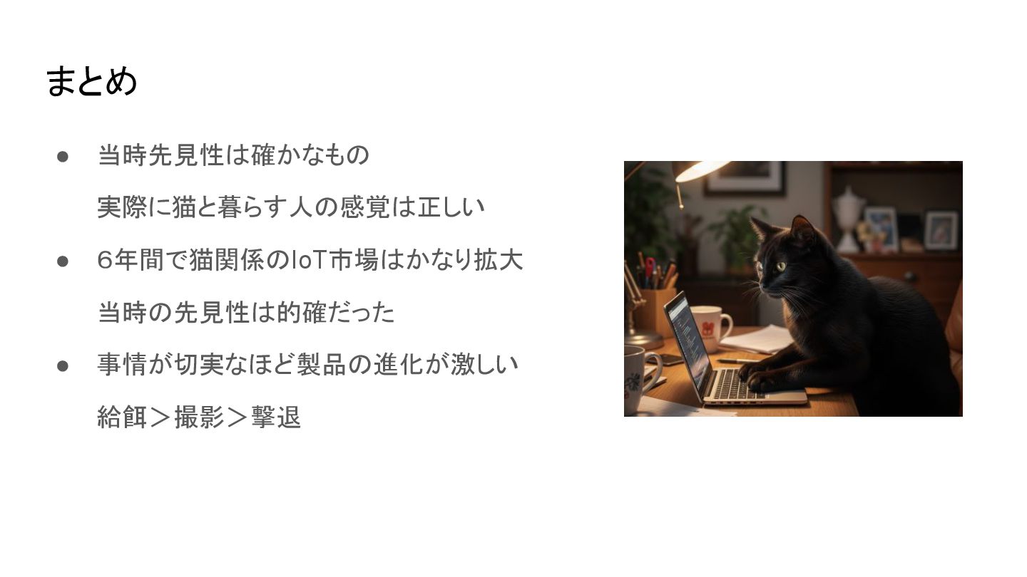 まとめ • 当時先見性は確かなもの 実際に猫と暮らす人の感覚は正しい • 6年間で猫関係のIoT市場はかなり拡大 当時の先見性は的確だった • 事情が切実なほど製品の進化が激しい 給餌>撮影>撃退