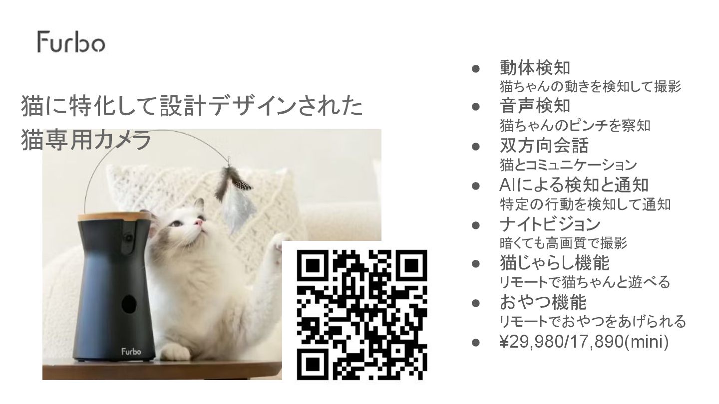 猫とコミュニケーション • AIによる検知と通知 特定の行動を検知して通知 • ナイトビジョン 暗くても高画質で撮影 • 猫じゃらし機能 リモートで猫ちゃんと遊べる • おやつ機能 リモートでおやつをあげられる • ¥29,980/17,890(mini)