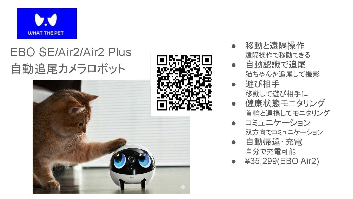 • 遊び相手 移動して遊び相手に • 健康状態モニタリング 首輪と連携してモニタリング • コミュニケーション 双方向でコミュニケーション • 自動帰還・充電 自分で充電可能 • ¥35,299(EBO Air2)