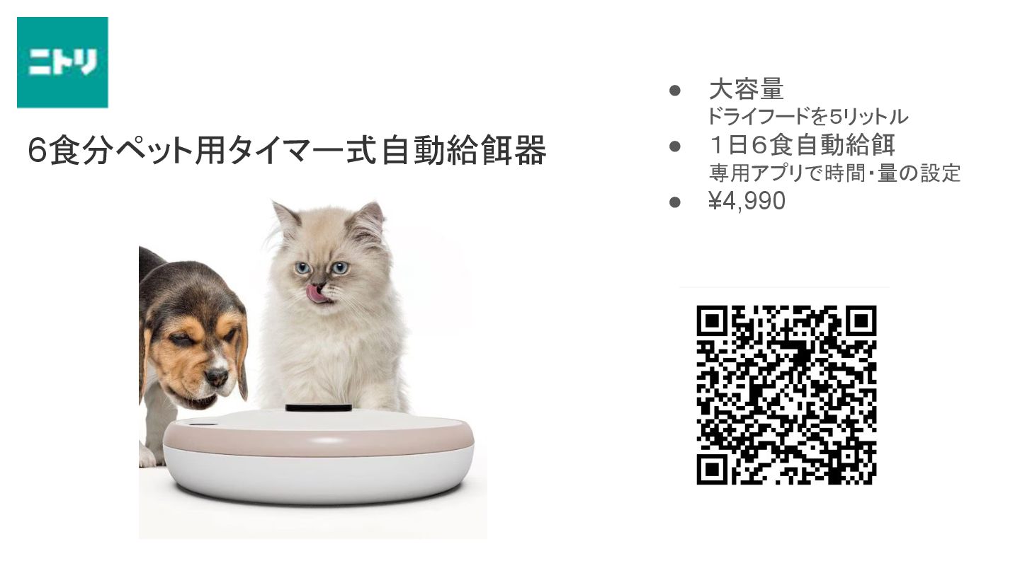 6食分ペット用タイマー式自動給餌器 • 大容量 ドライフードを5リットル • 1日6食自動給餌 専用アプリで時間・量の設定 • ¥4,990