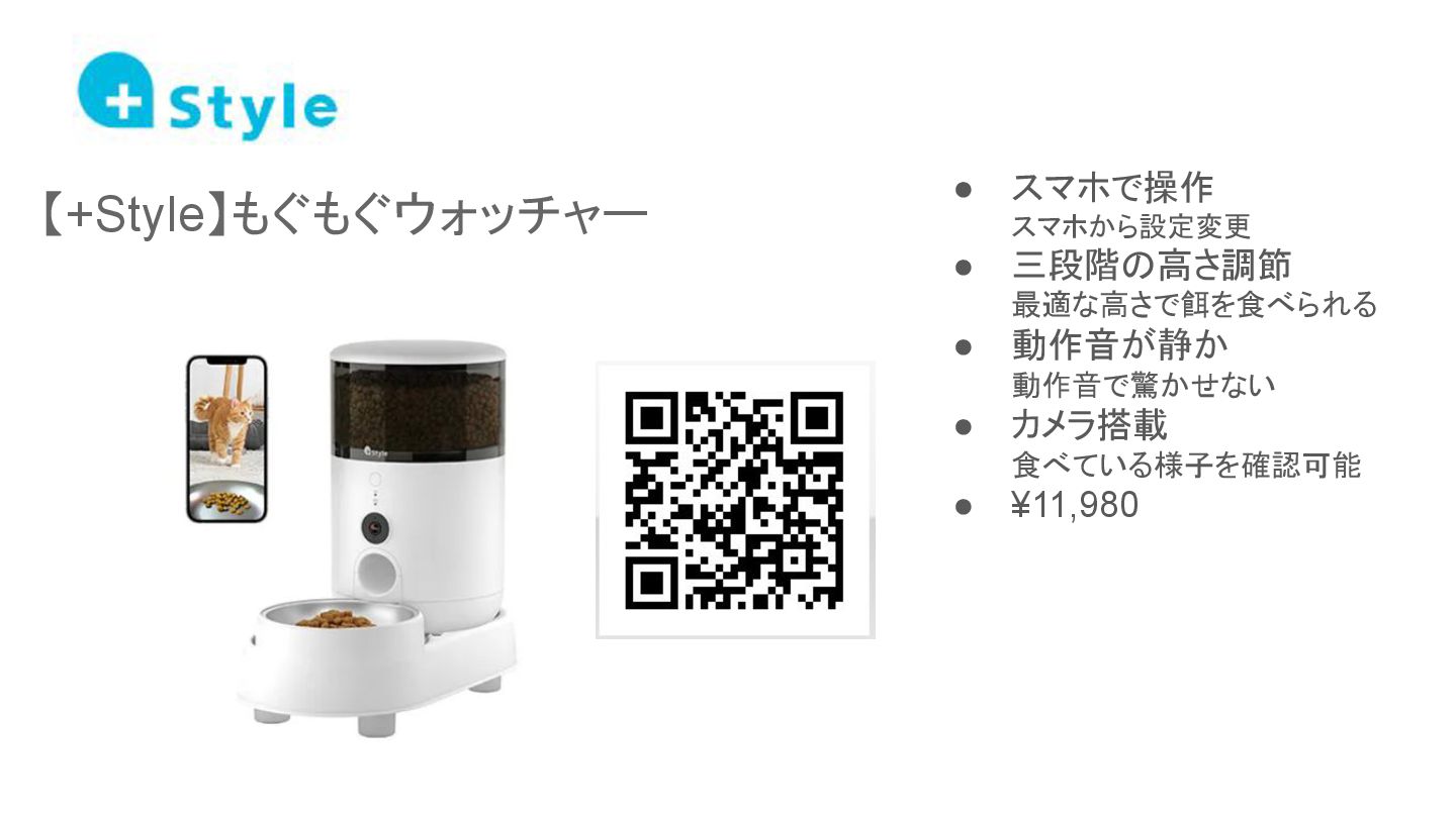【+Style】もぐもぐウォッチャー • スマホで操作 スマホから設定変更 • 三段階の高さ調節 最適な高さで餌を食べられる • 動作音が静か 動作音で驚かせない
