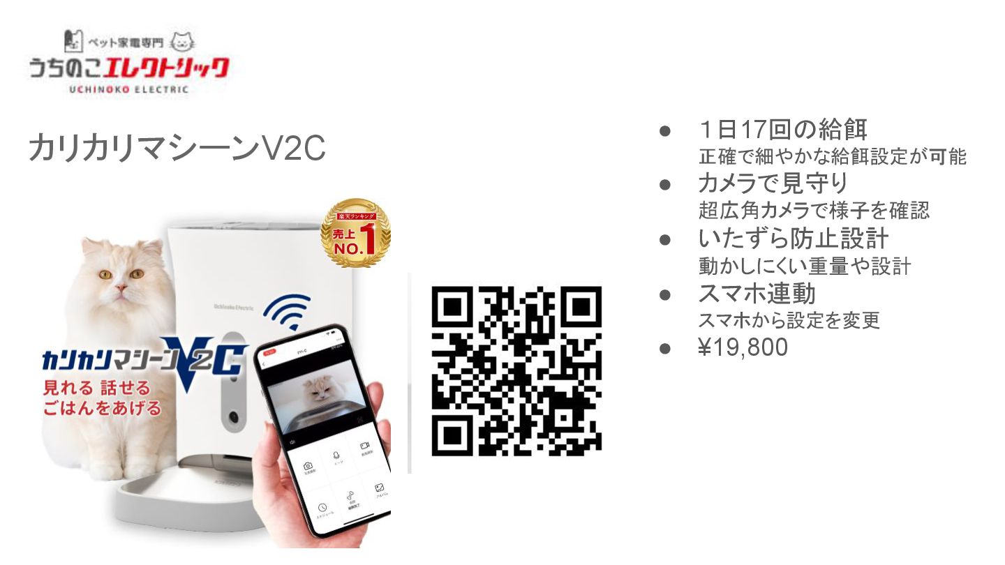 カリカリマシーンV2C • 1日17回の給餌 正確で細やかな給餌設定が可能 • カメラで見守り 超広角カメラで様子を確認 • いたずら防止設計 動かしにくい重量や設計