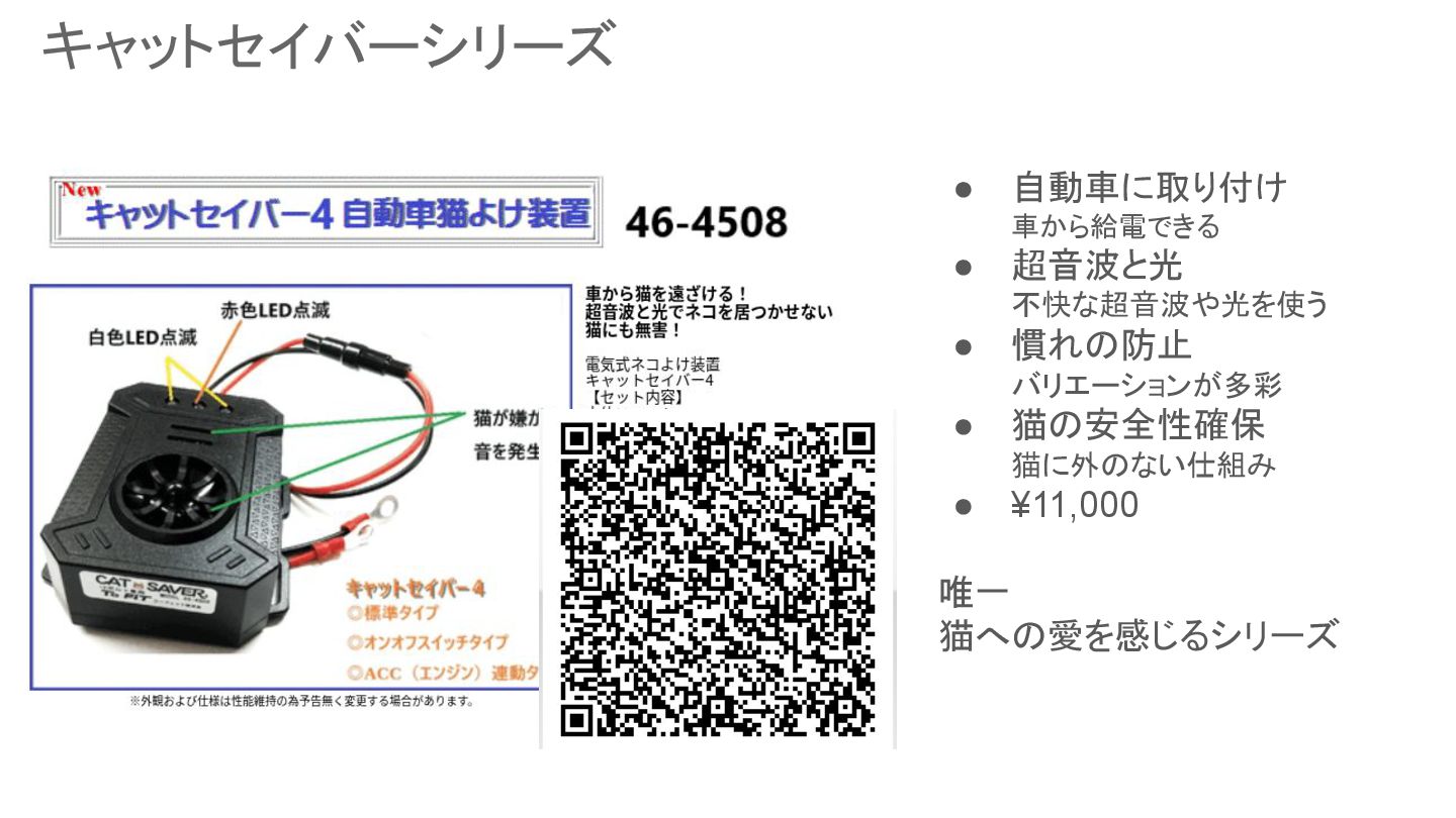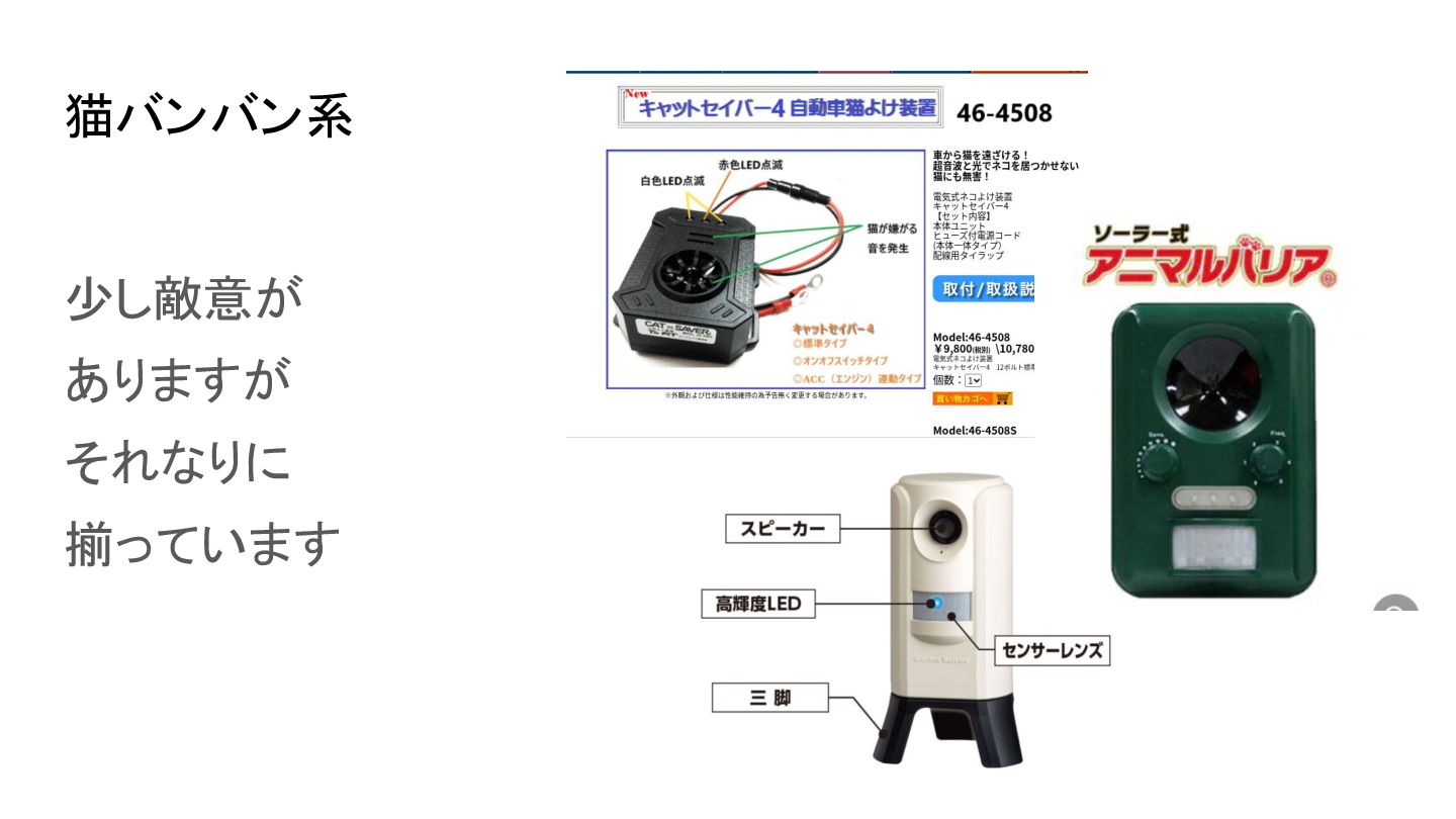 キャットセイバーシリーズ • 自動車に取り付け 車から給電できる • 超音波と光 不快な超音波や光を使う • 慣れの防止 バリエーションが多彩