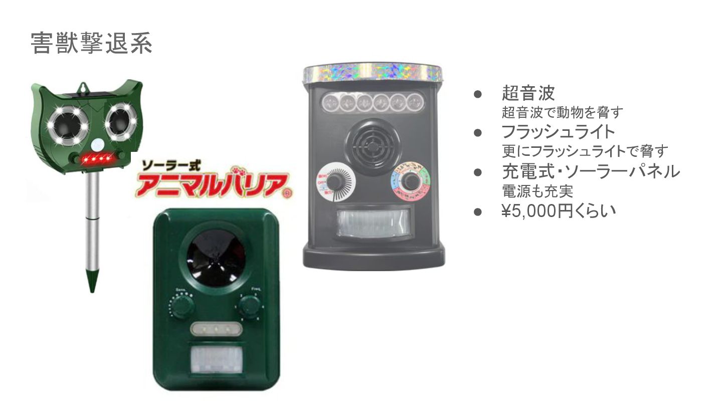 害獣撃退系 • 超音波 超音波で動物を脅す • フラッシュライト 更にフラッシュライトで脅す • 充電式・ソーラーパネル 電源も充実