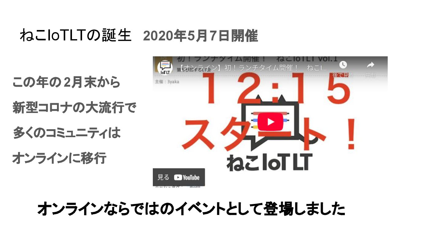 ねこIoTLTの誕生 2020年5月7日開催 この年の2月末から 新型コロナの大流行で 多くのコミュニティは オンラインに移行 オンラインならではのイベントとして登場しました