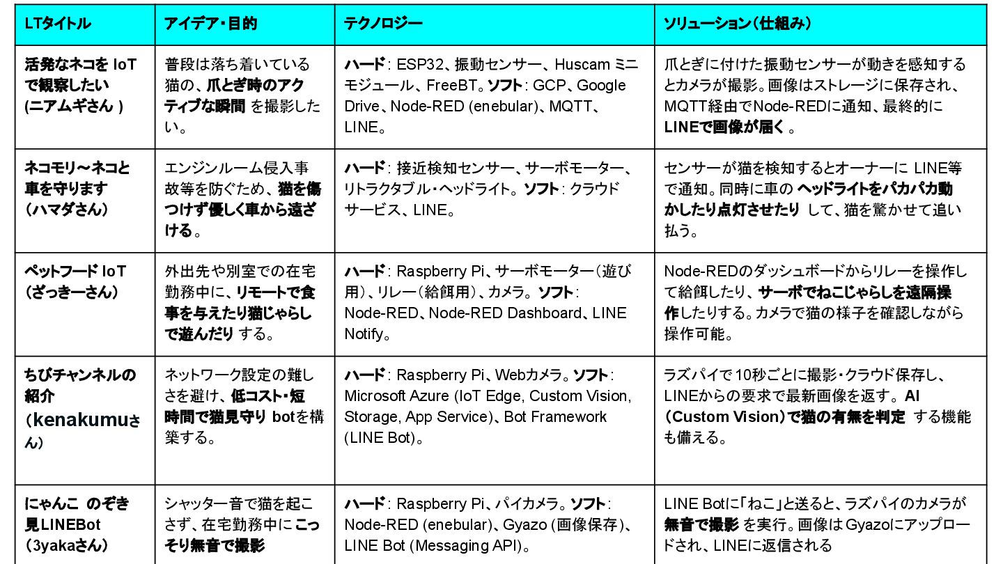 猫の、爪とぎ時のアク ティブな瞬間 を撮影した い。 ハード : ESP32、振動センサー、 Huscam ミニ モジュール、FreeBT。ソフト: GCP、Google Drive、Node-RED (enebular)、MQTT、 LINE。 爪とぎに付けた振動センサーが動きを感知する とカメラが撮影。画像はストレージに保存され、 MQTT経由でNode-REDに通知、最終的に LINEで画像が届く 。 ネコモリ~ネコと 車を守ります (ハマダさん) エンジンルーム侵入事 故等を防ぐため、 猫を傷 つけず優しく車から遠ざ ける。 ハード : 接近検知センサー、サーボモーター、 リトラクタブル・ヘッドライト。 ソフト: クラウド サービス、LINE。 センサーが猫を検知するとオーナーに LINE等 で通知。同時に車の ヘッドライトをパカパカ動 かしたり点灯させたり して、猫を驚かせて追い 払う。 ペットフード IoT (ざっきーさん) 外出先や別室での在宅 勤務中に、リモートで食 事を与えたり猫じゃらし で遊んだり する。 ハード : Raspberry Pi、サーボモーター(遊び 用)、リレー(給餌用)、カメラ。 ソフト: Node-RED、Node-RED Dashboard、LINE Notify。 Node-REDのダッシュボードからリレーを操作し て給餌したり、サーボでねこじゃらしを遠隔操 作したりする。カメラで猫の様子を確認しながら 操作可能。 ちびチャンネルの 紹介 (kenakumuさ ん) ネットワーク設定の難し さを避け、低コスト・短 時間で猫見守り botを構 築する。 ハード : Raspberry Pi、Webカメラ。ソフト: Microsoft Azure (IoT Edge, Custom Vision, Storage, App Service)、Bot Framework (LINE Bot)。 ラズパイで10秒ごとに撮影・クラウド保存し、 LINEからの要求で最新画像を返す。 AI (Custom Vision)で猫の有無を判定 する機能 も備える。 にゃんこ のぞき 見LINEBot (3yakaさん) シャッター音で猫を起こ さず、在宅勤務中に こっ そり無音で撮影 ハード : Raspberry Pi、パイカメラ。ソフト: Node-RED (enebular)、Gyazo (画像保存)、 LINE Bot (Messaging API)。 LINE Botに「ねこ」と送ると、ラズパイのカメラが 無音で撮影 を実行。画像はGyazoにアップロー ドされ、LINEに返信される