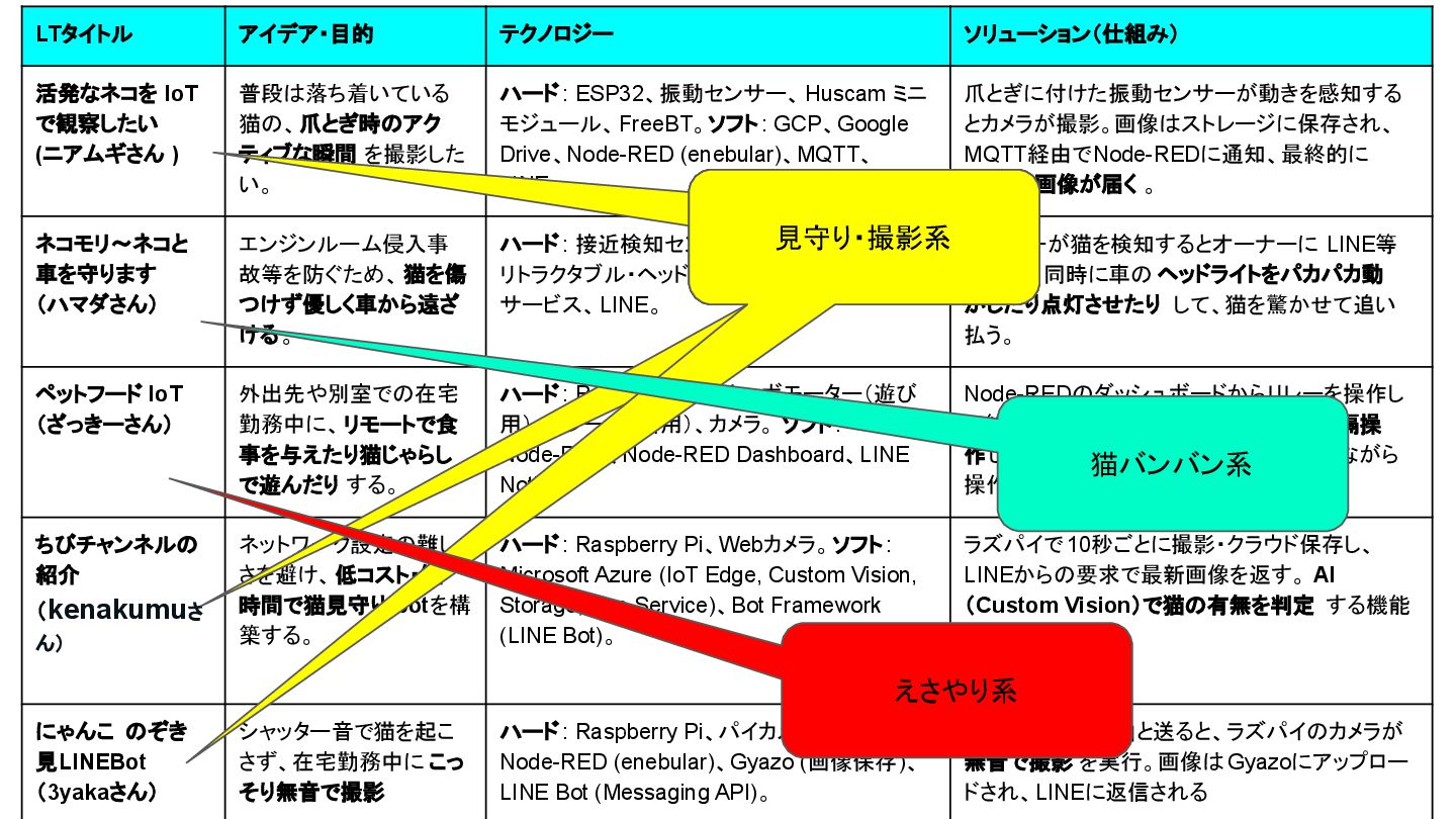 猫の、爪とぎ時のアク ティブな瞬間 を撮影した い。 ハード : ESP32、振動センサー、 Huscam ミニ モジュール、FreeBT。ソフト: GCP、Google Drive、Node-RED (enebular)、MQTT、 LINE。 爪とぎに付けた振動センサーが動きを感知する とカメラが撮影。画像はストレージに保存され、 MQTT経由でNode-REDに通知、最終的に LINEで画像が届く 。 ネコモリ~ネコと 車を守ります (ハマダさん) エンジンルーム侵入事 故等を防ぐため、 猫を傷 つけず優しく車から遠ざ ける。 ハード : 接近検知センサー、サーボモーター、 リトラクタブル・ヘッドライト。 ソフト: クラウド サービス、LINE。 センサーが猫を検知するとオーナーに LINE等 で通知。同時に車の ヘッドライトをパカパカ動 かしたり点灯させたり して、猫を驚かせて追い 払う。 ペットフード IoT (ざっきーさん) 外出先や別室での在宅 勤務中に、リモートで食 事を与えたり猫じゃらし で遊んだり する。 ハード : Raspberry Pi、サーボモーター(遊び 用)、リレー(給餌用)、カメラ。 ソフト: Node-RED、Node-RED Dashboard、LINE Notify。 Node-REDのダッシュボードからリレーを操作し て給餌したり、サーボでねこじゃらしを遠隔操 作したりする。カメラで猫の様子を確認しながら 操作可能。 ちびチャンネルの 紹介 (kenakumuさ ん) ネットワーク設定の難し さを避け、低コスト・短 時間で猫見守り botを構 築する。 ハード : Raspberry Pi、Webカメラ。ソフト: Microsoft Azure (IoT Edge, Custom Vision, Storage, App Service)、Bot Framework (LINE Bot)。 ラズパイで10秒ごとに撮影・クラウド保存し、 LINEからの要求で最新画像を返す。 AI (Custom Vision)で猫の有無を判定 する機能 も備える。 にゃんこ のぞき 見LINEBot (3yakaさん) シャッター音で猫を起こ さず、在宅勤務中に こっ そり無音で撮影 ハード : Raspberry Pi、パイカメラ。ソフト: Node-RED (enebular)、Gyazo (画像保存)、 LINE Bot (Messaging API)。 LINE Botに「ねこ」と送ると、ラズパイのカメラが 無音で撮影 を実行。画像はGyazoにアップロー ドされ、LINEに返信される 見守り・撮影系 猫バンバン系 えさやり系
