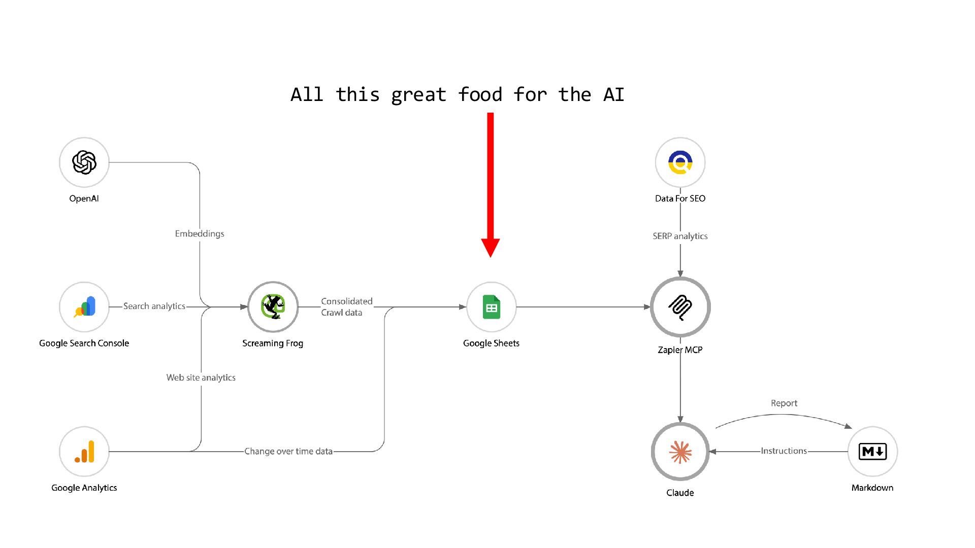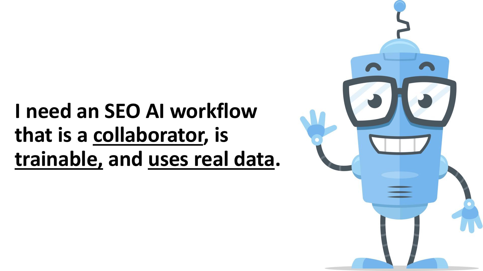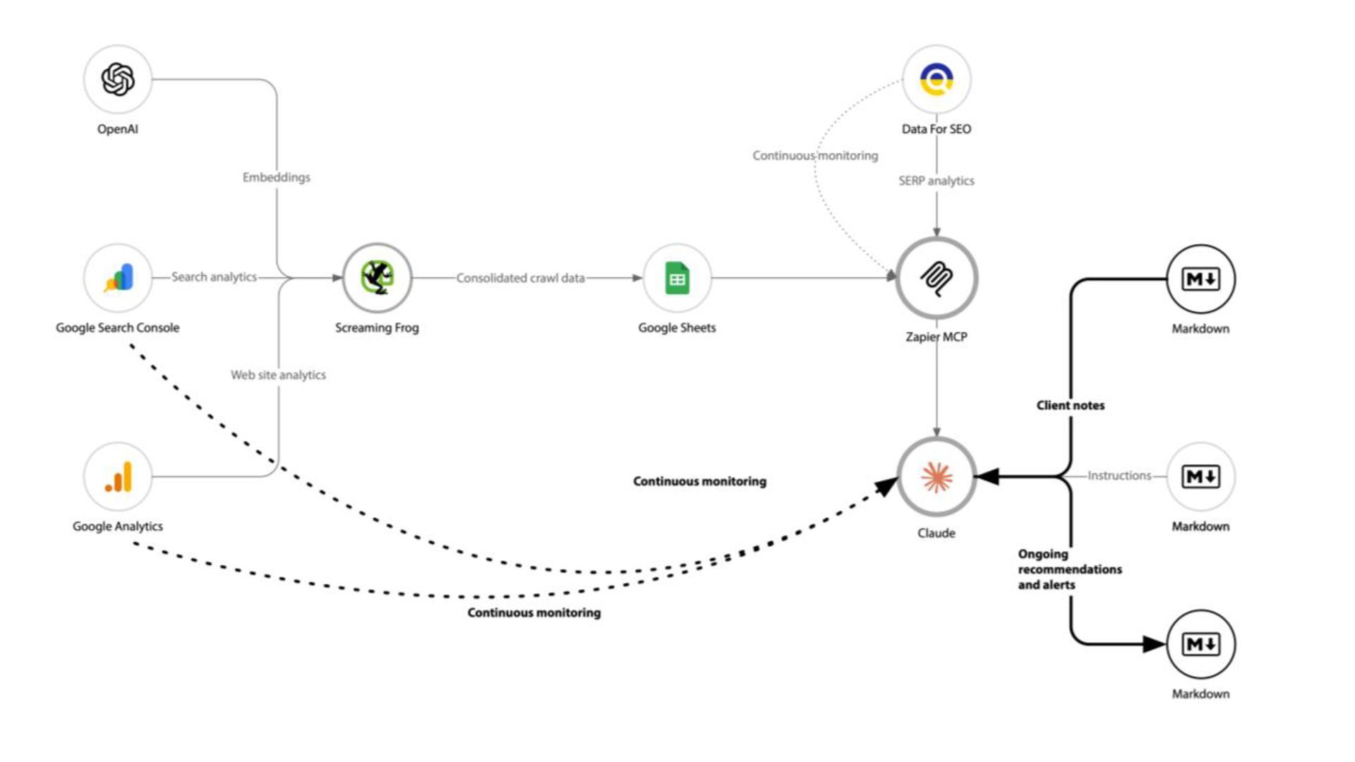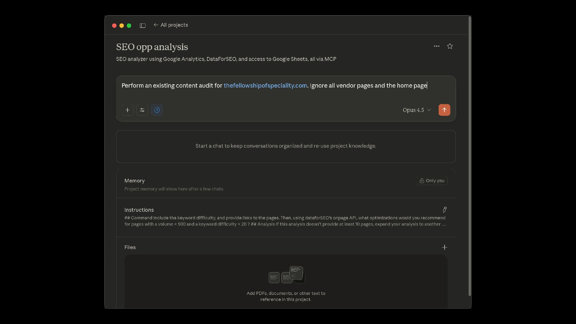 You can’t build an AI SEO expert. You can build an AI SEO audit workflow that analyzes your site’s existing content, traffic data, and crawl data for opportunities. I’ll show you how I do it, from the inputs — ScreamingFrog, Google Analytics, DataForSEO — to the prompts and project.