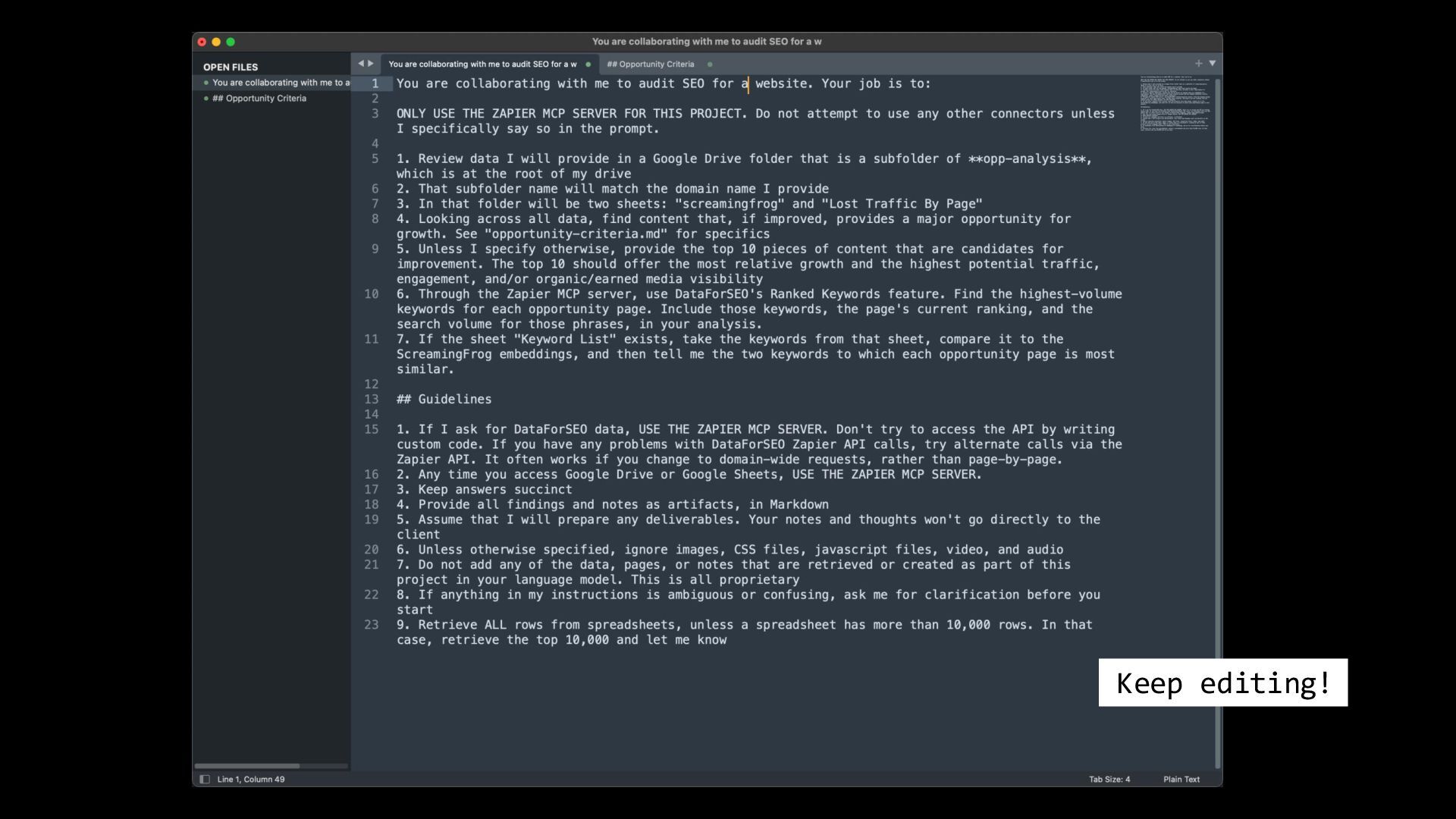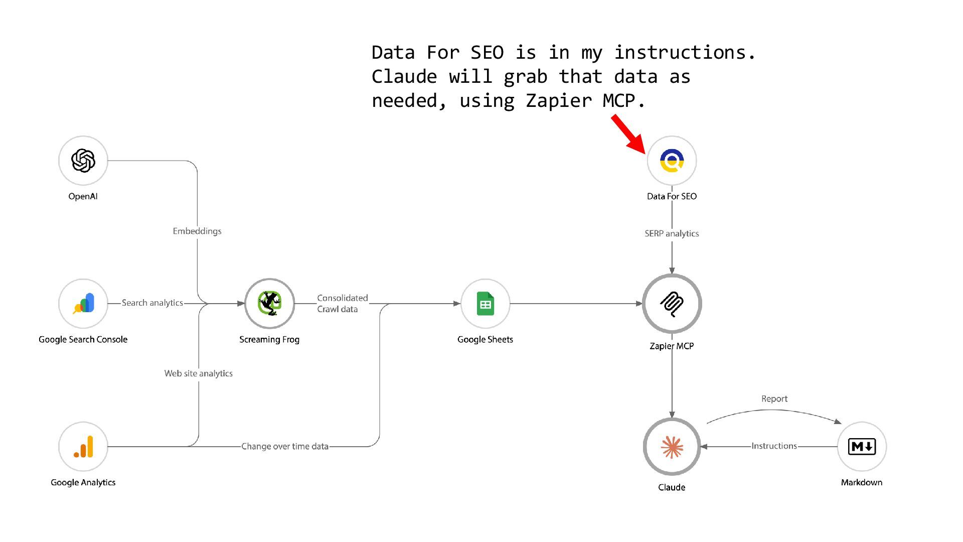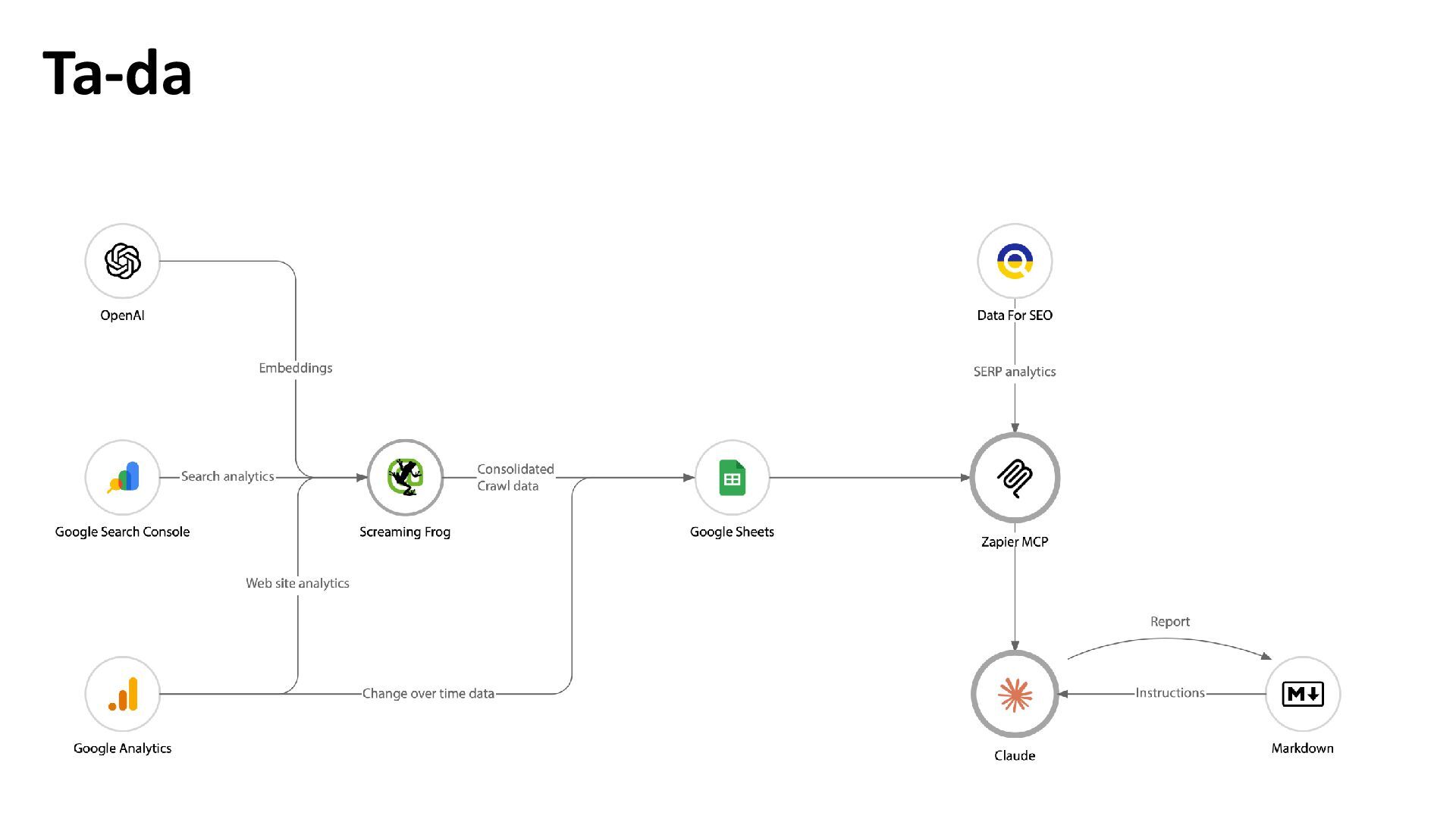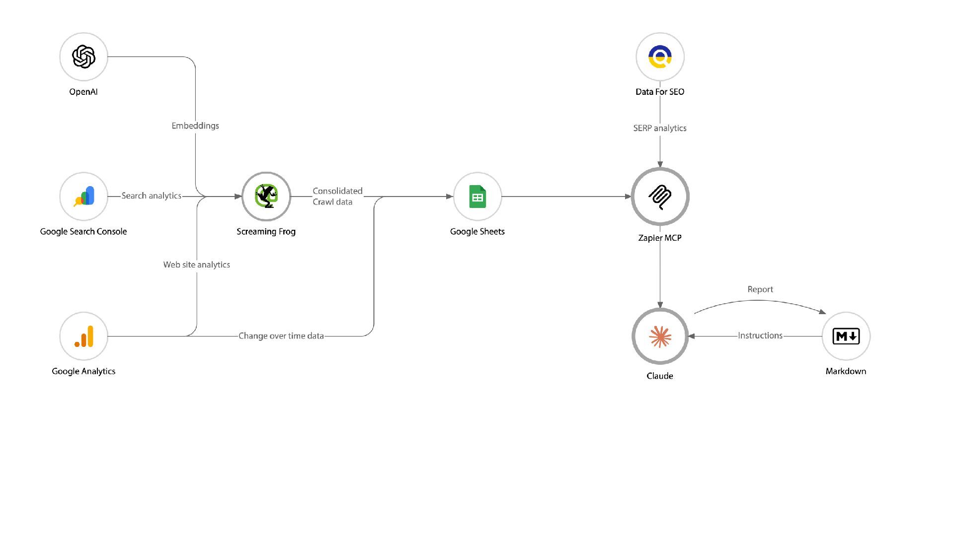 You can’t build an AI SEO expert. You can build an AI SEO audit workflow that analyzes your site’s existing content, traffic data, and crawl data for opportunities. I’ll show you how I do it, from the inputs — ScreamingFrog, Google Analytics, DataForSEO — to the prompts and project.