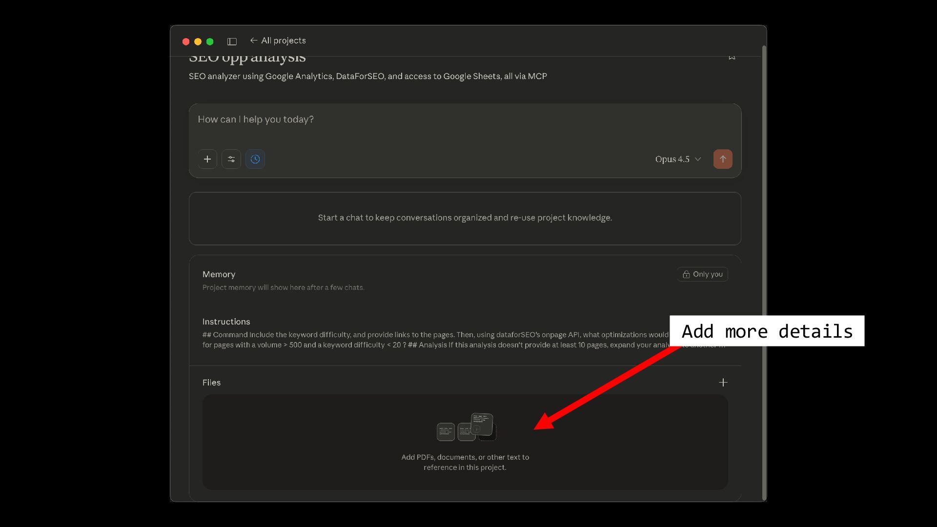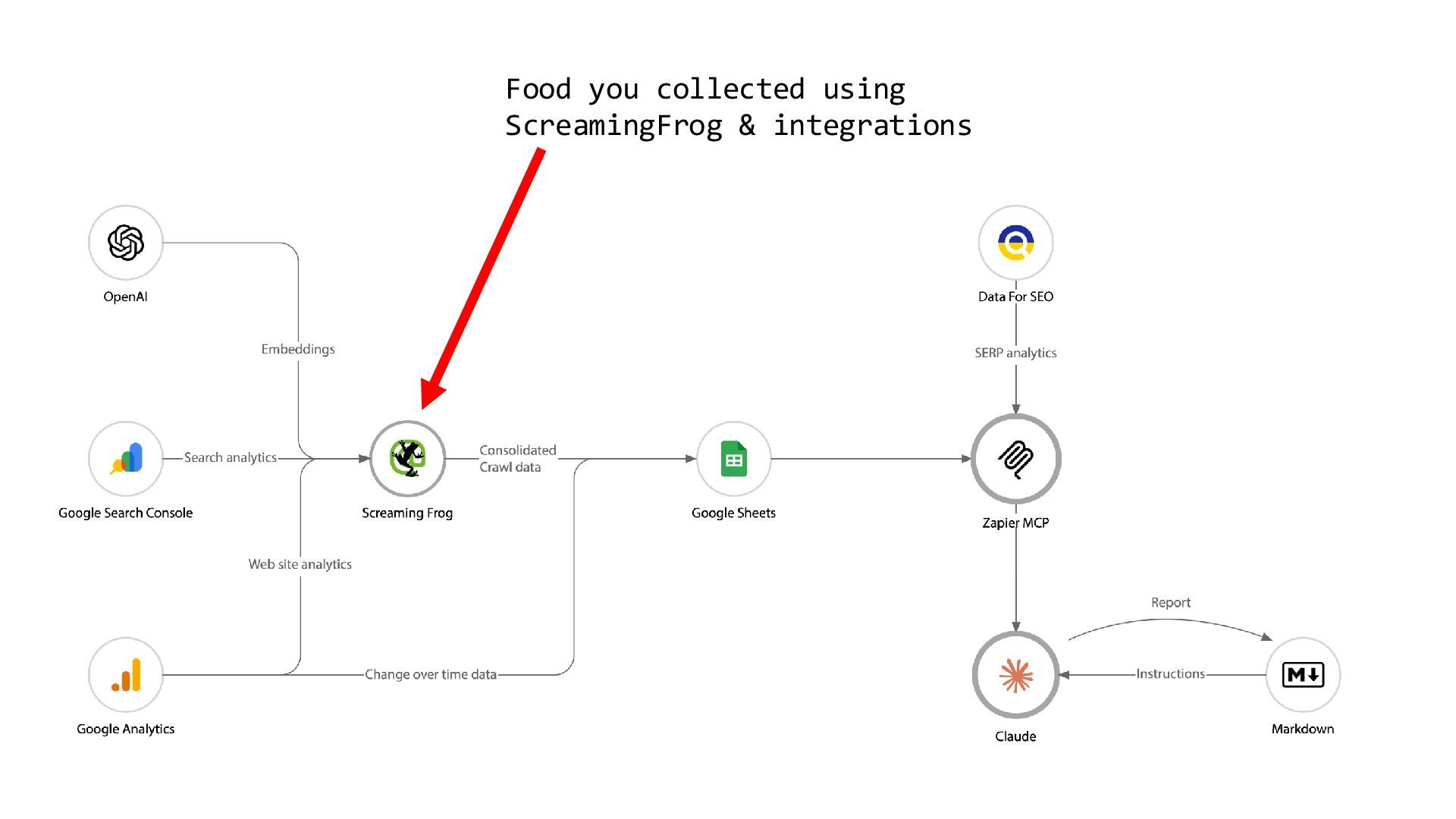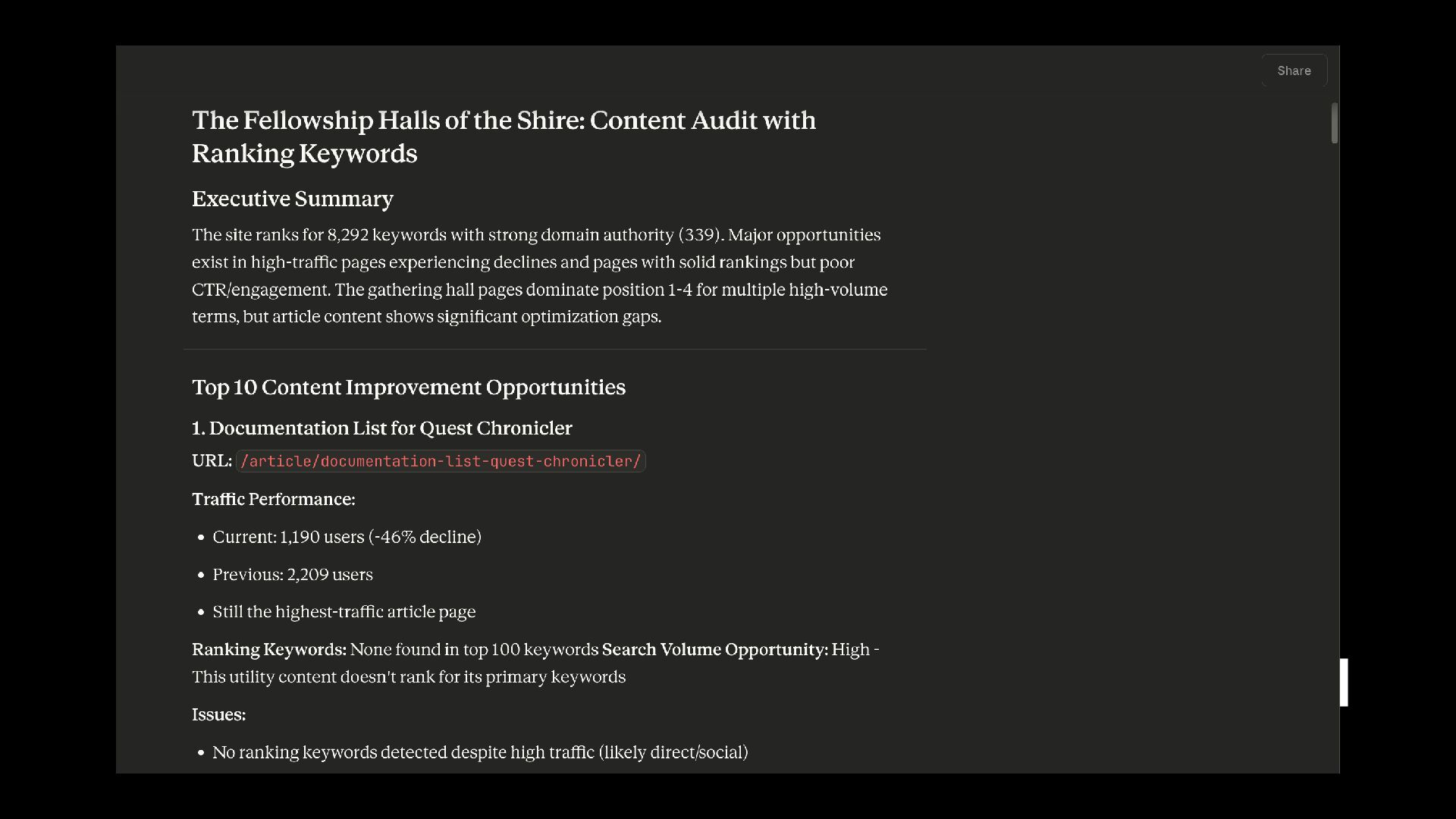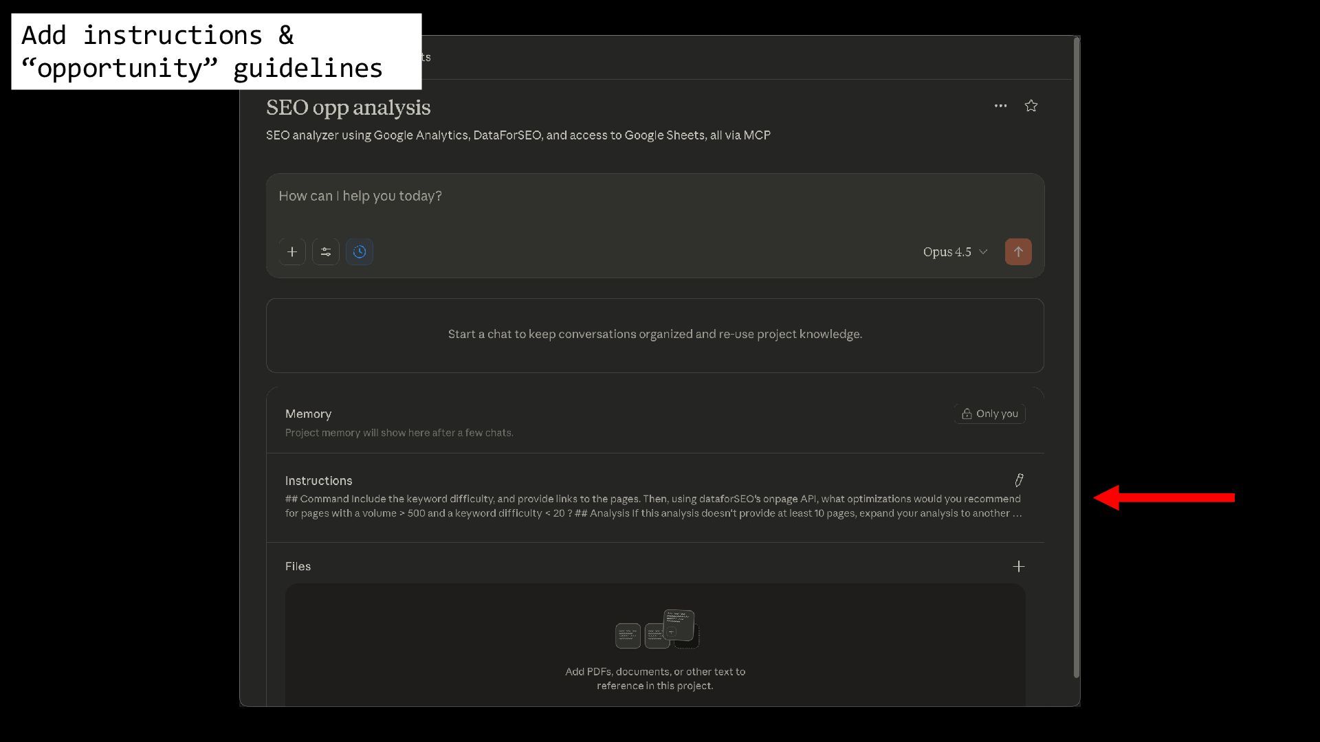 You can’t build an AI SEO expert. You can build an AI SEO audit workflow that analyzes your site’s existing content, traffic data, and crawl data for opportunities. I’ll show you how I do it, from the inputs — ScreamingFrog, Google Analytics, DataForSEO — to the prompts and project.