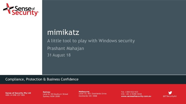 Level 15, 401 Docklands Drive Docklands VIC 3008 Tel. 1300 922 923 Intl. +61 2 9290 4444 www.senseofsecurity.com.au Sense of Security Pty Ltd ABN 14 098 237 908 @ITSecurityAU Compliance, Protection & Business Confidence 31 August 18 mimikatz A little tool to play with Windows security Prashant Mahajan