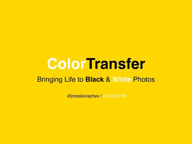 image colorization.” European Conference on Computer Vision. Springer, Cham, 2016. • https://github.com/richzhang/colorization • Wallner, E.: How to colorize black & white photos with just 100 lines of neural network code Medium.com, Oct 29, 2017 • Dahl, R.: Automatic Colorization Tinyclouds.org, Jan, 2016 • Cheng, Z., Yang, Q., Sheng, B.: Deep colorization. In: Proceedings of the IEEE International Conference on Computer Vision. (2015) 415–423 • Zhang, Richard, et al. "Real-time user-guided image colorization with learned deep priors." arXiv preprint arXiv:1705.02999 (2017). • https://github.com/junyanz/interactive-deep-colorization • Karpathy, Andrej. "Cs231n convolutional neural networks for visual recognition." Neural networks 1 (2016).