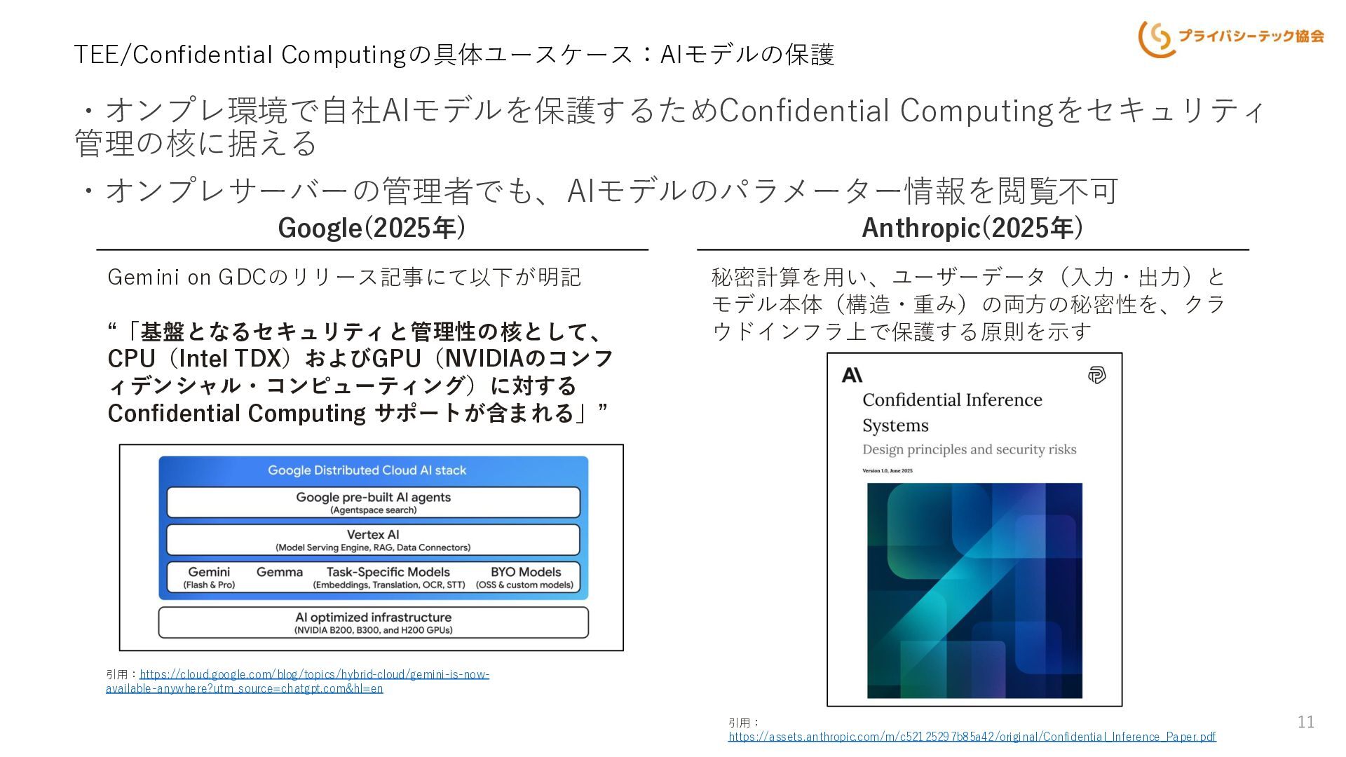 GDCのリリース記事にて以下が明記 “「基盤となるセキュリティと管理性の核として、 CPU(Intel TDX)およびGPU(NVIDIAのコンフ ィデンシャル・コンピューティング)に対する Confidential Computing サポートが含まれる」” Anthropic(2025年) 秘密計算を用い、ユーザーデータ(入力・出力)と モデル本体(構造・重み)の両方の秘密性を、クラ ウドインフラ上で保護する原則を示す 引用: https://assets.anthropic.com/m/c52125297b85a42/original/Confidential_Inference_Paper.pdf 引用:https://cloud.google.com/blog/topics/hybrid-cloud/gemini-is-now- available-anywhere?utm_source=chatgpt.com&hl=en