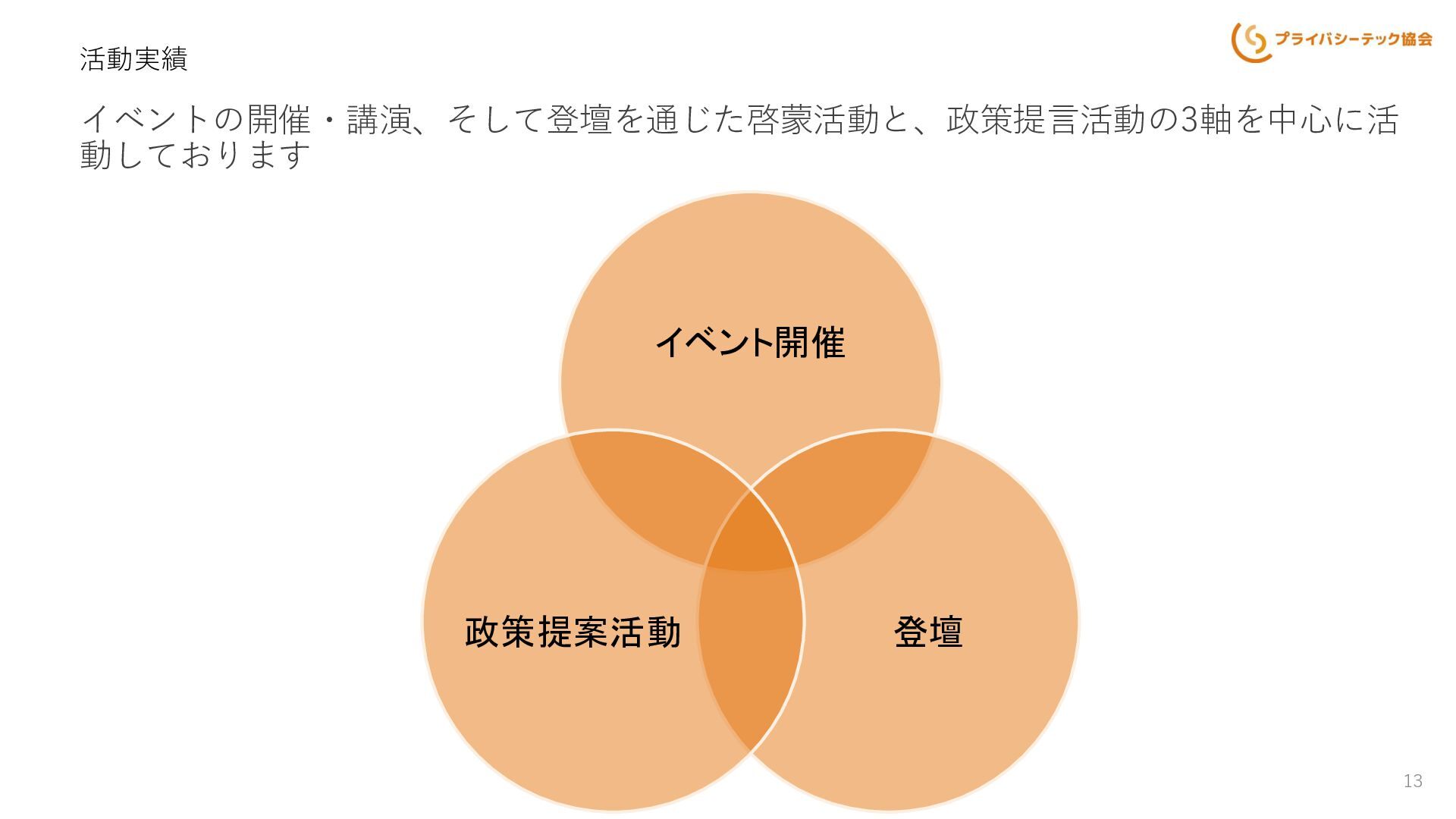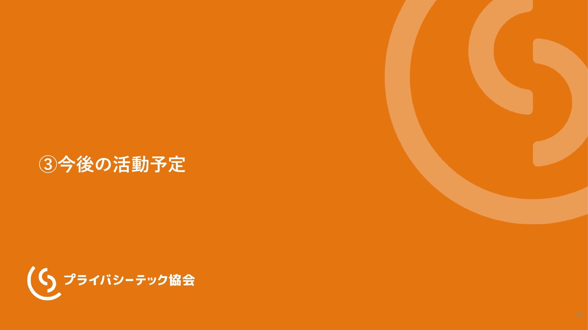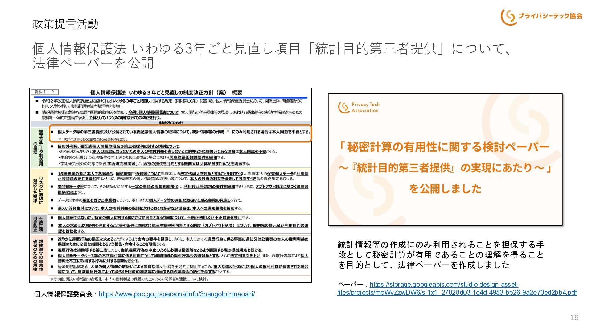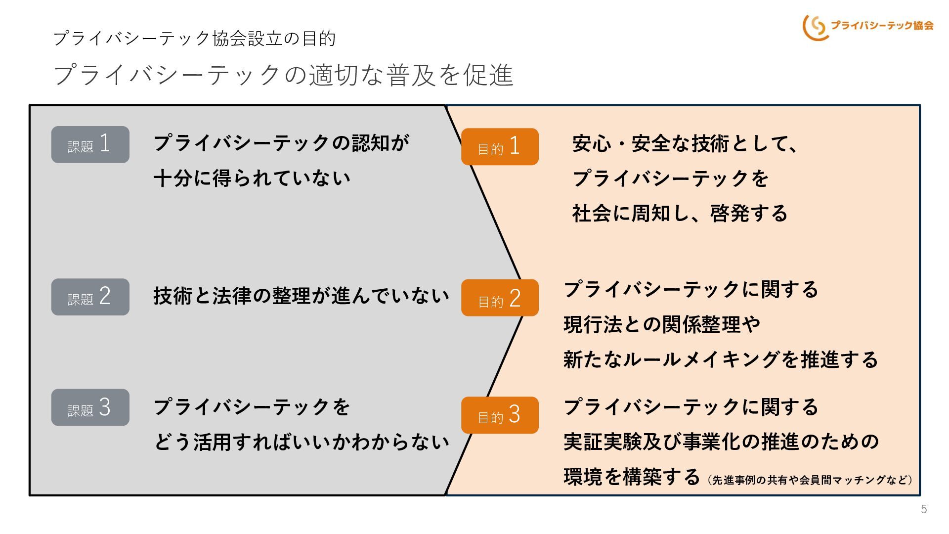 技術と法律の整理が進んでいない 課題 3 プライバシーテックを どう活用すればいいかわからない 目的 1 安心・安全な技術として、 プライバシーテックを 社会に周知し、啓発する 目的 2 プライバシーテックに関する 現行法との関係整理や 新たなルールメイキングを推進する 目的 3 プライバシーテックに関する 実証実験及び事業化の推進のための 環境を構築する(先進事例の共有や会員間マッチングなど)