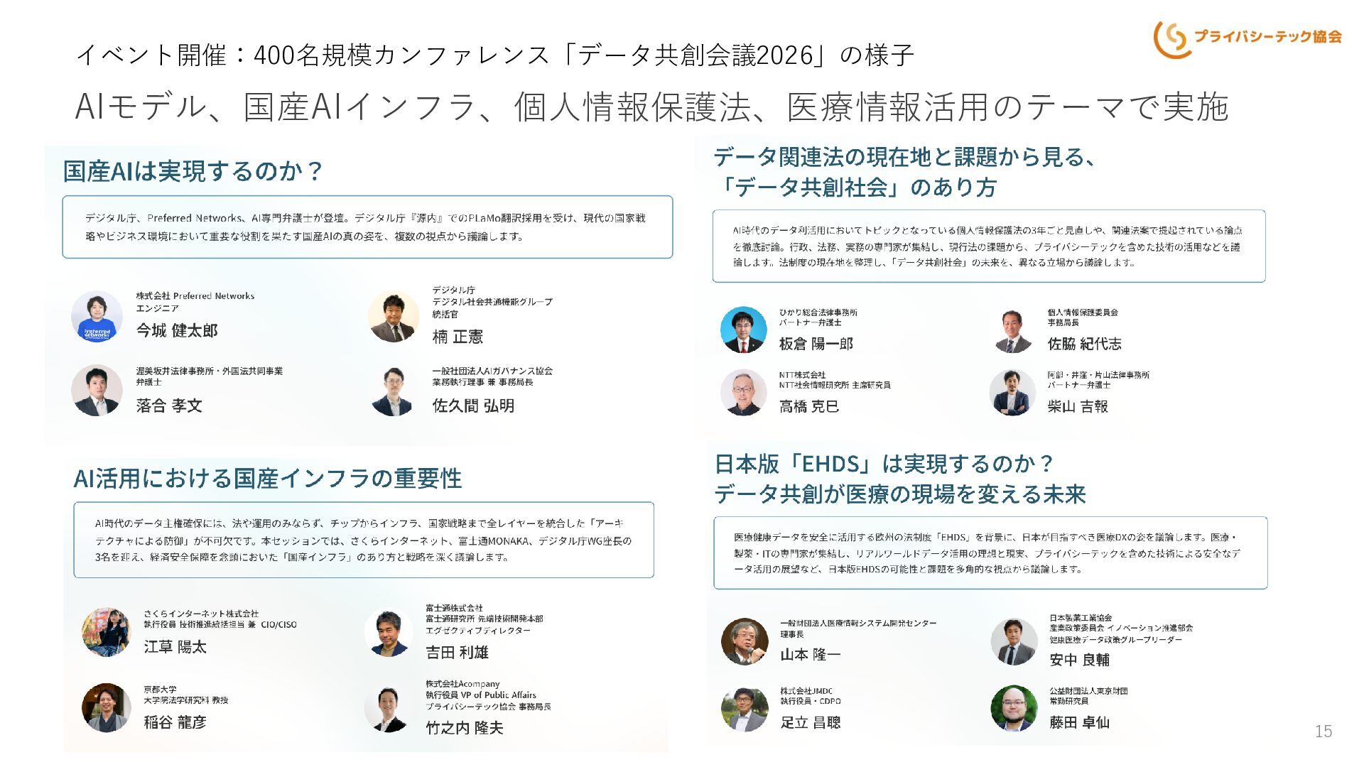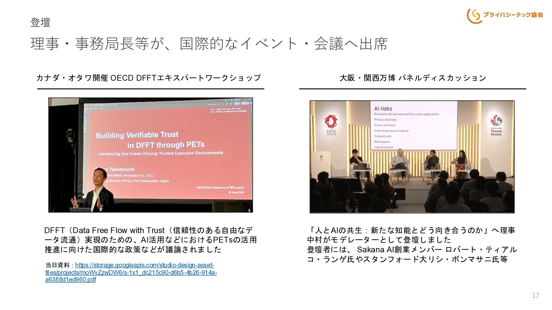 Trust(信頼性のある自由なデ ータ流通)実現のための、AI活用などにおけるPETsの活用 推進に向けた国際的な政策などが議論されました 大阪・関西万博 パネルディスカッション 「人とAIの共生:新たな知能とどう向き合うのか」へ理事 中村がモデレーターとして登壇しました 登壇者には、 Sakana AI創業メンバー ロバート・ティアル コ・ランゲ氏やスタンフォード大リシ・ボンマサニ氏等 当日資料:https://storage.googleapis.com/studio-design-asset- files/projects/moWvZzwDW6/s-1x1_dc215c90-d6b5-4b26-914a- a6388d1ed960.pdf