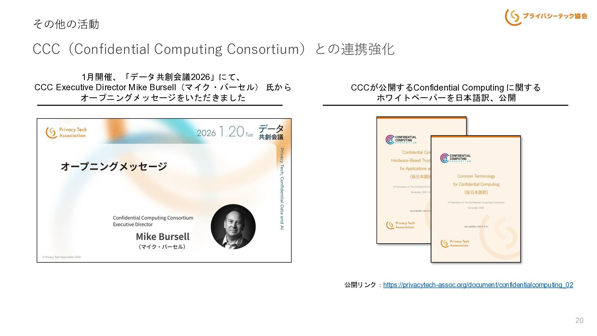 ータ利活用(DCR)の実現 - 金融庁「AIディスカッションペーパ ー」の具体ユースケースの検討 等 個人情報保護法WG(予定) 「個人情報保護法 3年ごと見直し」のテ ーマとなっている「統計目的第三者提 供」実現に向け、技術認定等を想定した、 ガイドライン・認証制度の作成 Confidential AI WG(予定) AIプラットフォームを利用する際に、信 頼できる状態とするために、どのような 仕組み・技術があるのかを整理・ガイド ライン等でアウトプットすることを想定