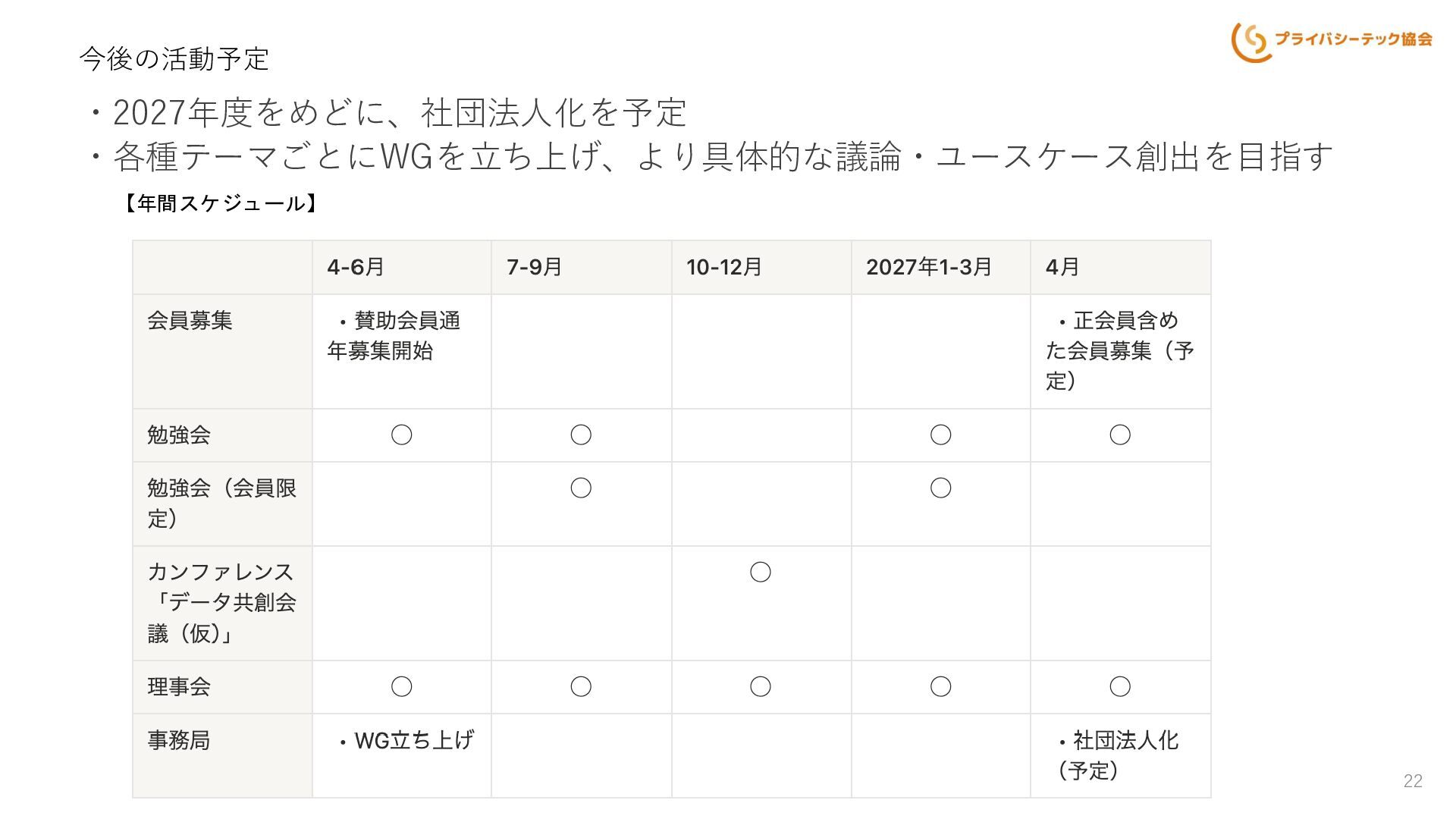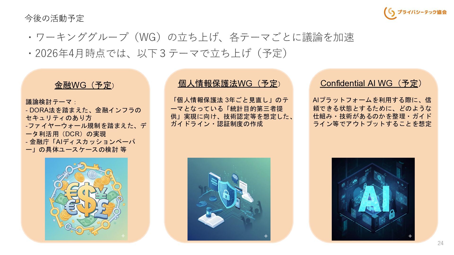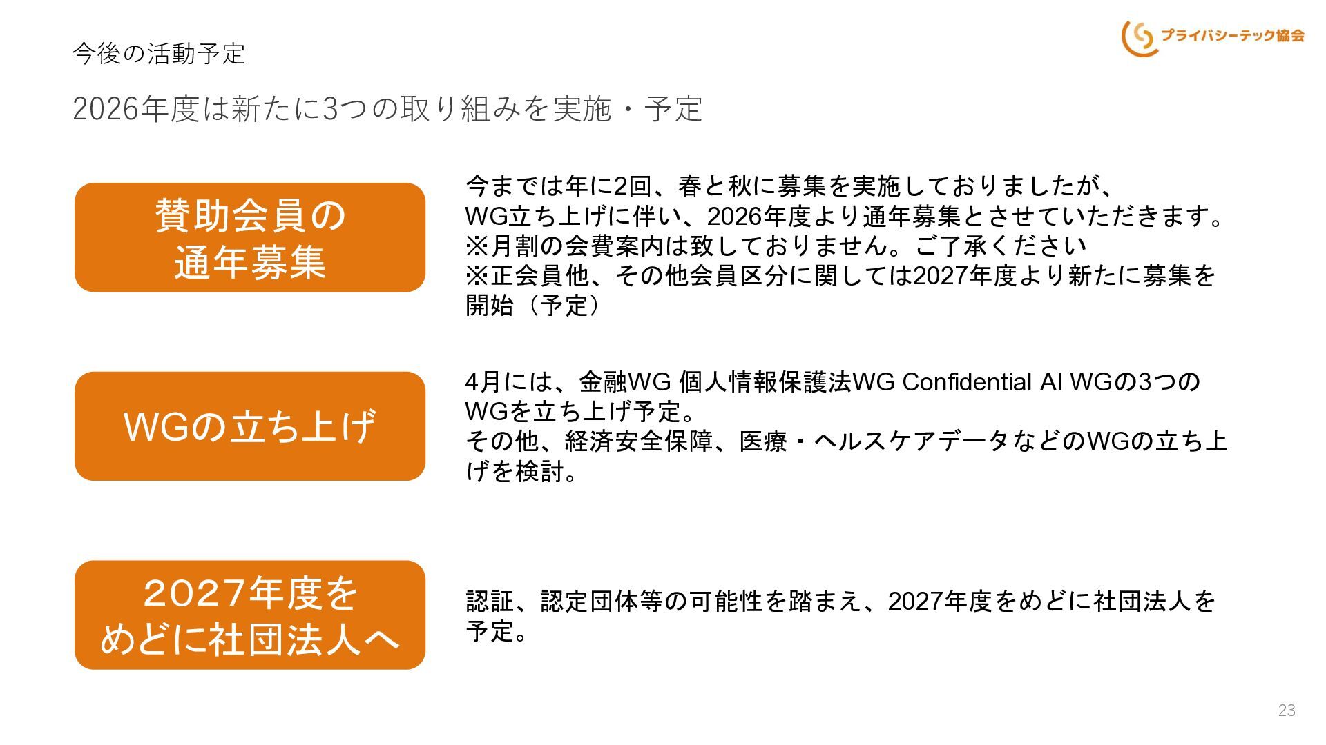 ※月割の会費案内は致しておりません。ご了承ください ※正会員他、その他会員区分に関しては2027年度より新たに募集を 開始(予定) 4月には、金融WG 個人情報保護法WG Confidential AI WGの3つの WGを立ち上げ予定。 その他、経済安全保障、医療・ヘルスケアデータなどのWGの立ち上 げを検討。 認証、認定団体等の可能性を踏まえ、2027年度をめどに社団法人を 予定。