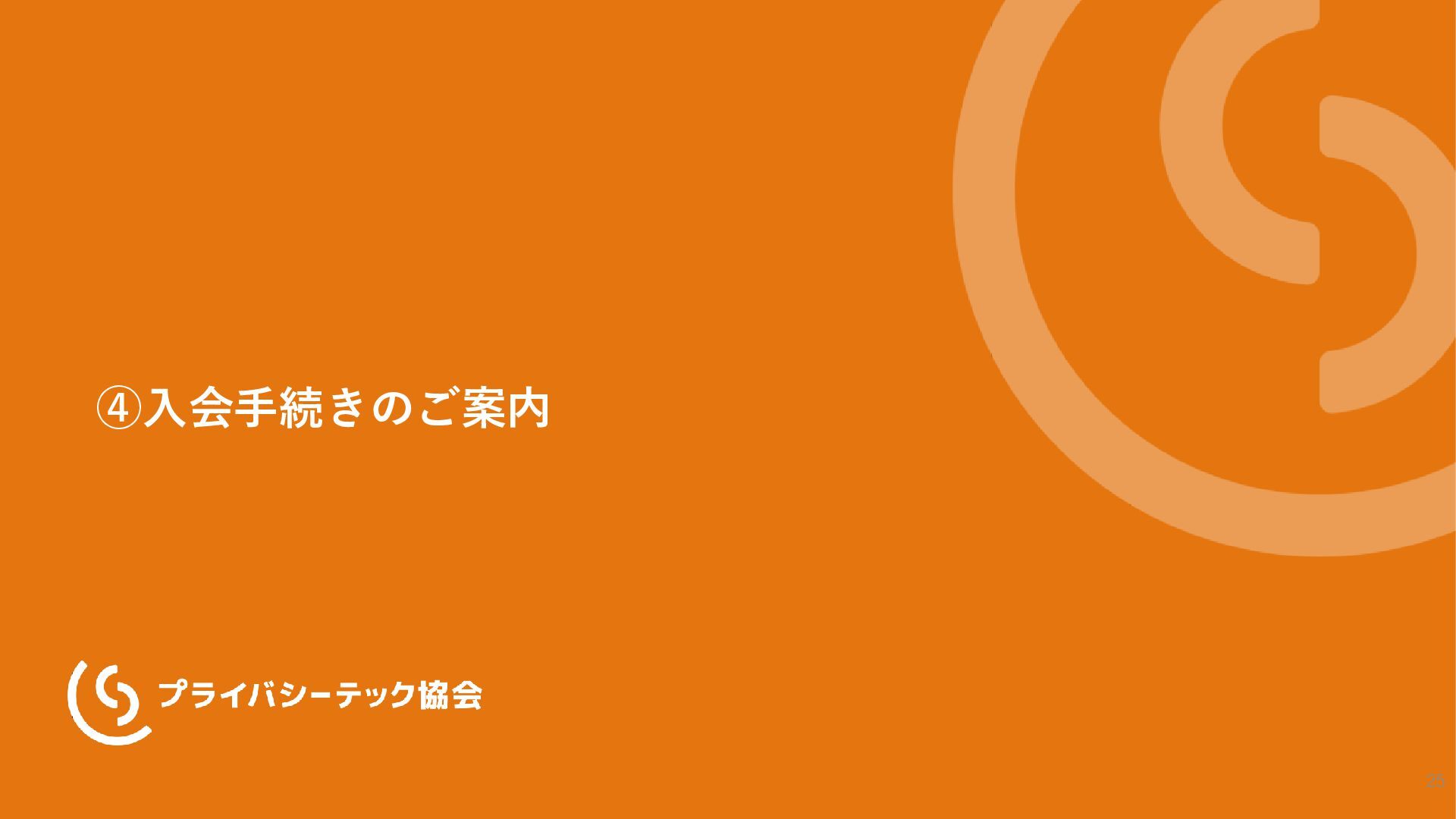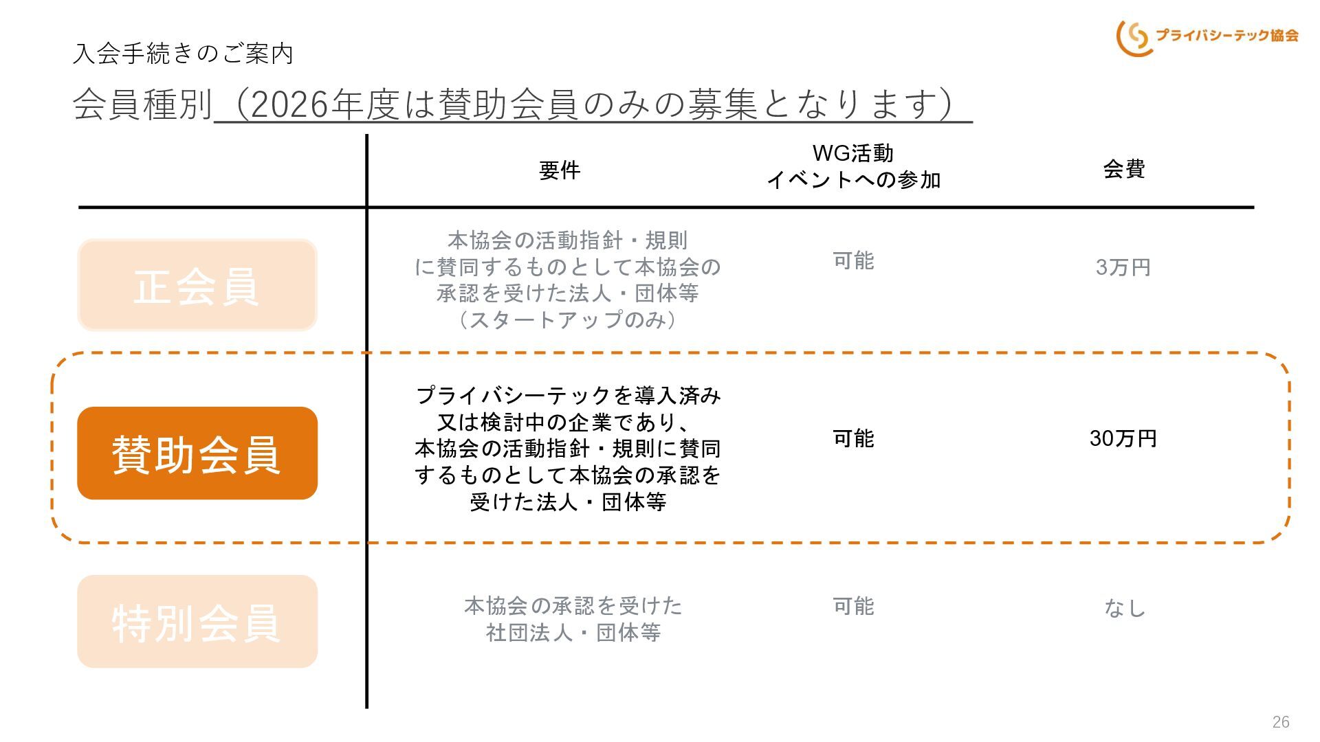 イベントへの参加 可能 可能 プライバシーテックを導入済み 又は検討中の企業であり、 本協会の活動指針・規則に賛同 するものとして本協会の承認を 受けた法人・団体等 本協会の承認を受けた 社団法人・団体等 本協会の活動指針・規則 に賛同するものとして本協会の 承認を受けた法人・団体等 (スタートアップのみ) 3万円 30万円 なし