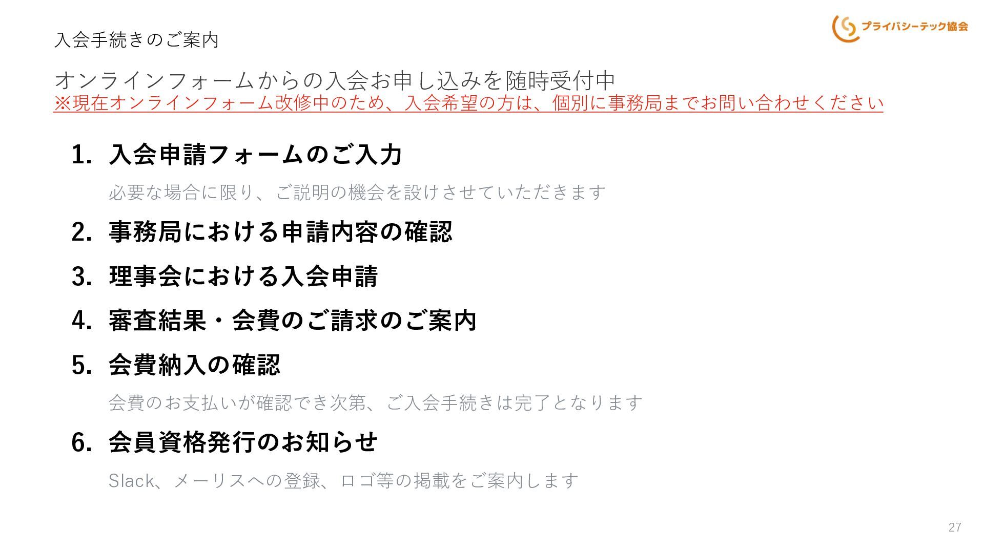 理事会における入会申請 4. 審査結果・会費のご請求のご案内 5. 会費納入の確認 会費のお支払いが確認でき次第、ご入会手続きは完了となります 6. 会員資格発行のお知らせ Slack、メーリスへの登録、ロゴ等の掲載をご案内します