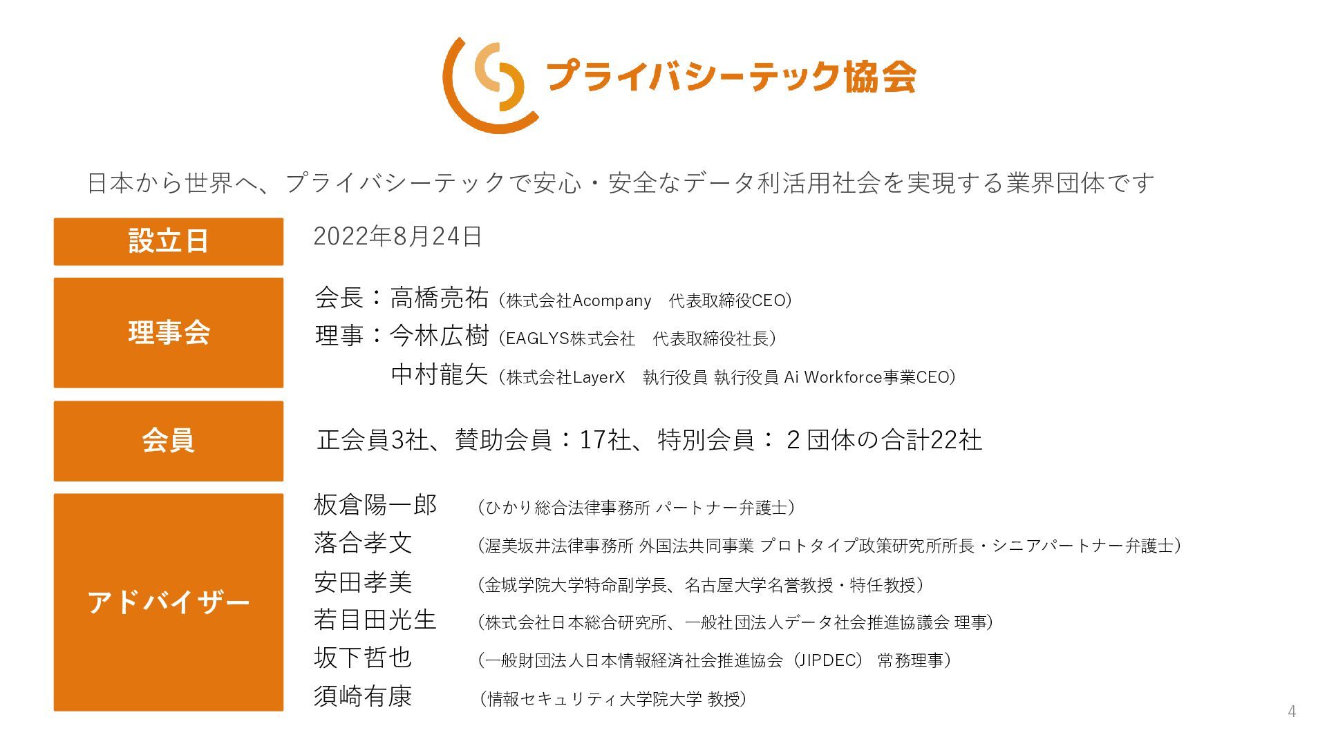 1. 4 日本から世界へ、プライバシーテックで安心・安全なデータ利活用社会を実現する業界団体です 2022年8月24日 設立日 会長:高橋亮祐(株式会社Acompany 代表取締役CEO) 理事:今林広樹(EAGLYS株式会社 代表取締役社長) 中村龍矢(株式会社LayerX 執行役員