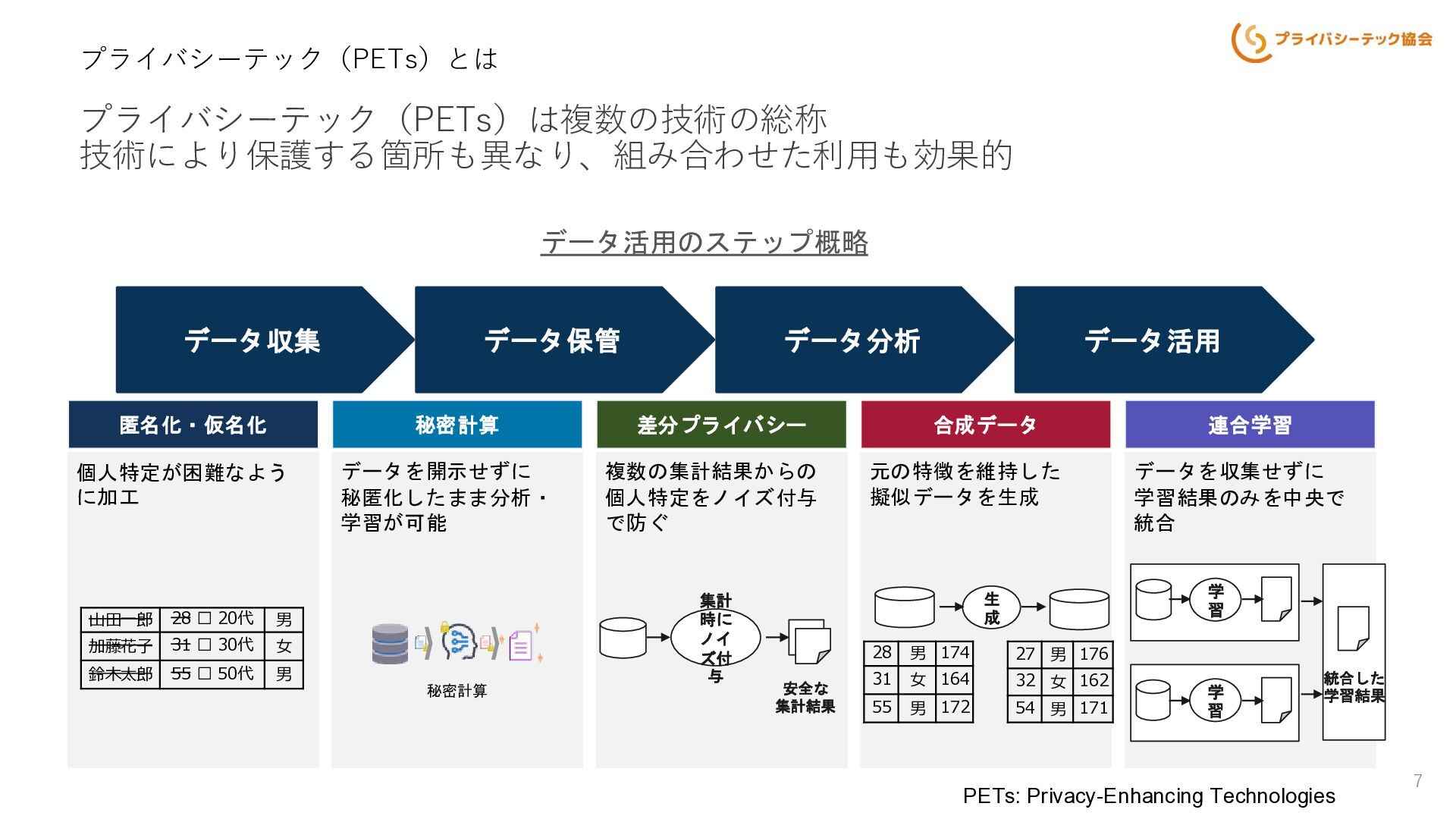 Privacy-Enhancing Technologies データを開示せずに 暗号化したまま分析・ 学習が可能 秘密計算 個人特定が困難なよう に加工 匿名化・仮名化 複数の集計結果からの 個人特定をノイズ付与 で防ぐ 差分プライバシー 元の特徴を維持した 擬似データを生成 合成データ データを収集せずに 学習結果のみを中央で 統合 連合学習 データを開示せずに 秘匿化したまま分析・ 学習が可能 秘密計算 個人特定が困難なよう に加工 匿名化・仮名化 複数の集計結果からの 個人特定をノイズ付与 で防ぐ 差分プライバシー 元の特徴を維持した 擬似データを生成 合成データ データを収集せずに 学習結果のみを中央で 統合 連合学習 学 習 学 習 統合した 学習結果 生 成 28 男 174 31 女 164 55 男 172 27 男 176 32 女 162 54 男 171 安全な 集計結果 集計 時に ノイ ズ付 与 山田一郎 28 🡪 20代 男 加藤花子 31 🡪 30代 女 鈴木太郎 55 🡪 50代 男 秘密計算