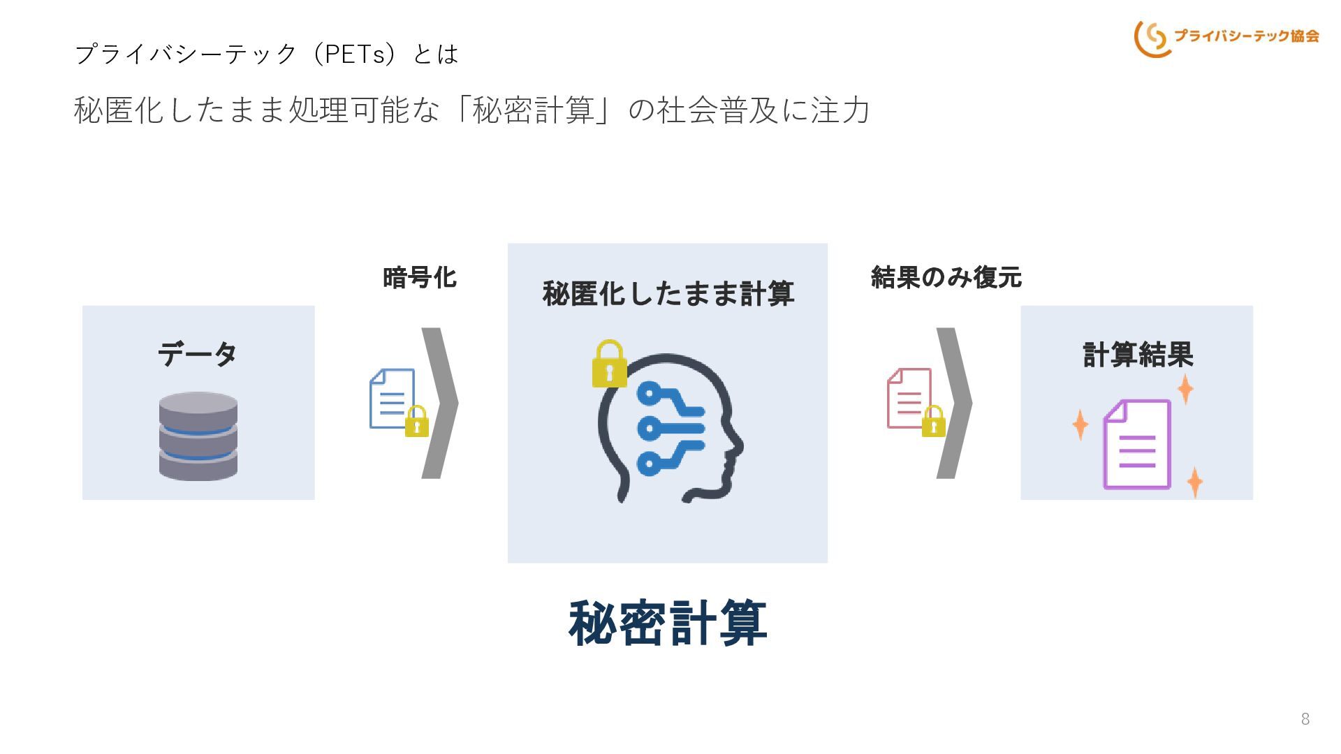 3. プライバシーテック(PETs)とは プライバシーテック(PETs)は複数の技術の総称 技術により保護する箇所も異なり、組み合わせた利用も効果的 7 データ収集 データ保管 データ分析 データ活用 データ活用のステップ概略 PETs: