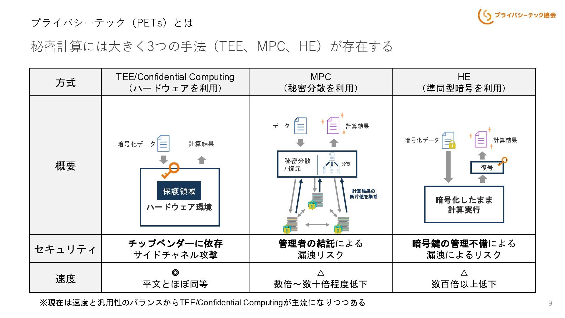 (準同型暗号を利用) 概要 セキュリティ チップベンダーに依存 サイドチャネル攻撃 管理者の結託による 漏洩リスク 暗号鍵の管理不備による 漏洩によるリスク 速度 ◎ 平文とほぼ同等 △ 数倍〜数十倍程度低下 △ 数百倍以上低下 計算結果 暗号化データ 保護領域 ハードウェア環境 計算結果 データ 計算結果の 断片値を集計 秘密分散 / 復元 分割 計算結果 暗号化データ 暗号化したまま 計算実行 復号 ※現在は速度と汎用性のバランスからTEE/Confidential Computingが主流になりつつある