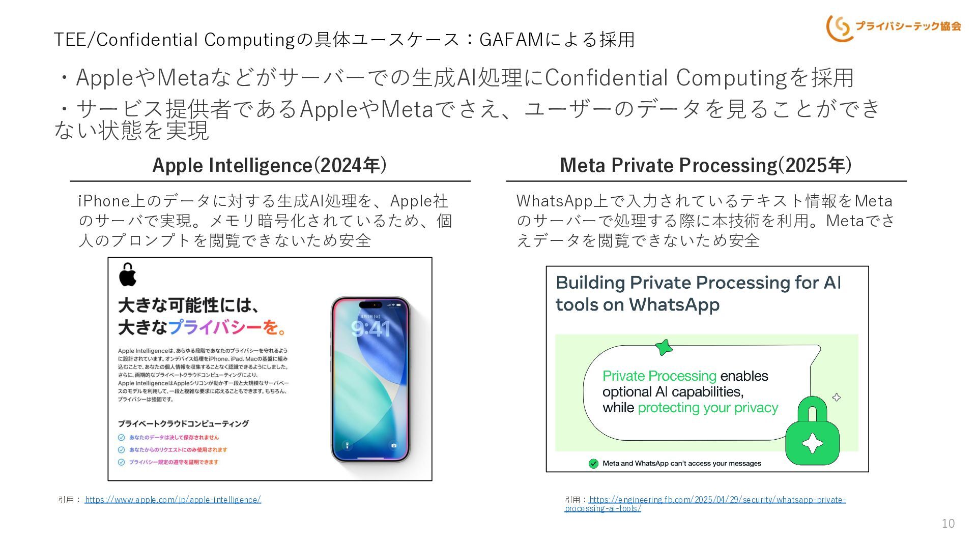 Meta Private Processing(2025年) WhatsApp上で入力されているテキスト情報をMeta のサーバーで処理する際に本技術を利用。Metaでさ えデータを閲覧できないため安全 Apple Intelligence(2024年) 引用: https://www.apple.com/jp/apple-intelligence/ 引用:https://engineering.fb.com/2025/04/29/security/whatsapp-private- processing-ai-tools/