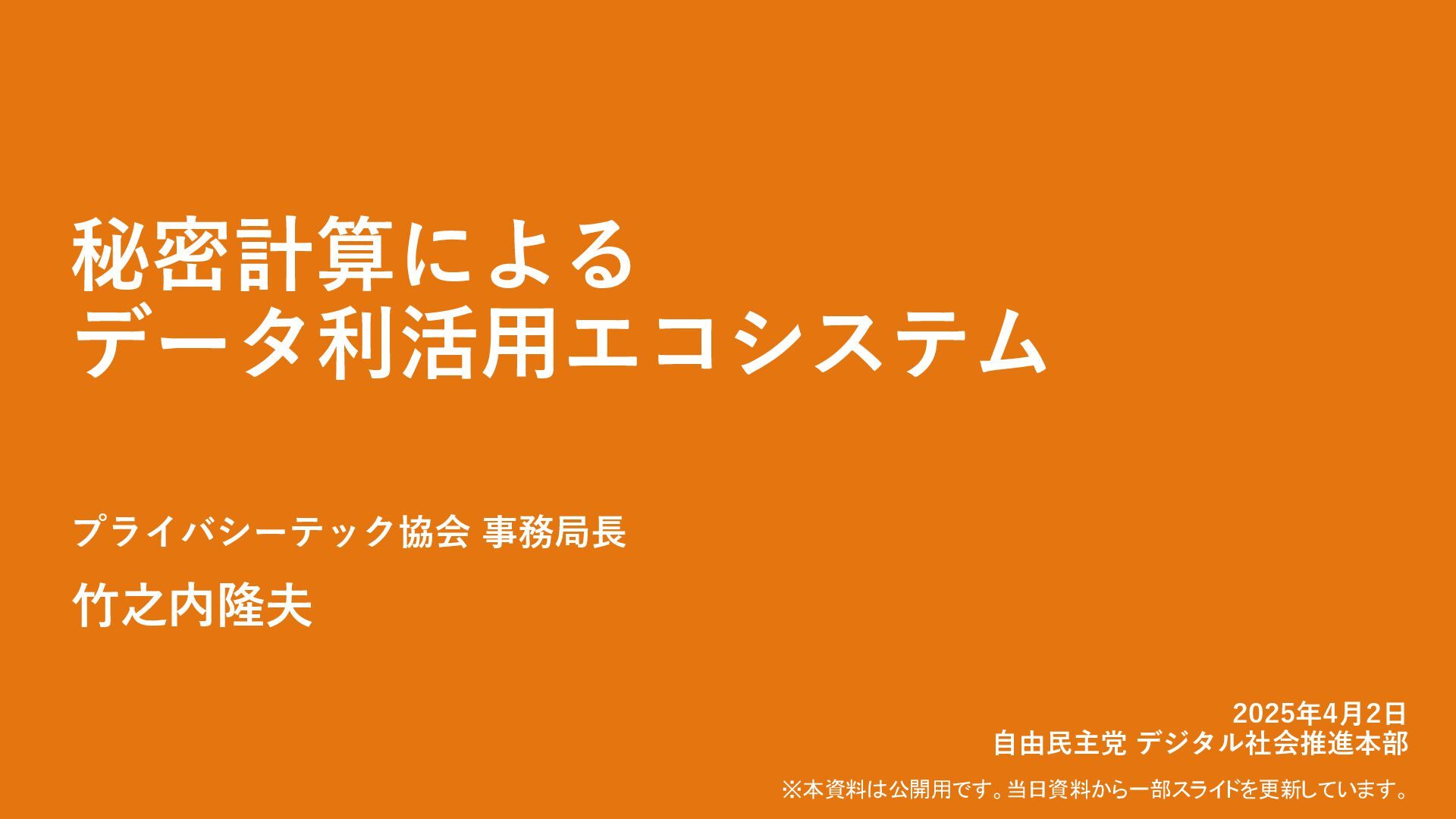 2025年4月2日、自由民主党 政務調査会 デジタル社会推進本部において、プライバシーテック協会が「AI分野における秘密計算」について説明した際の資料です。