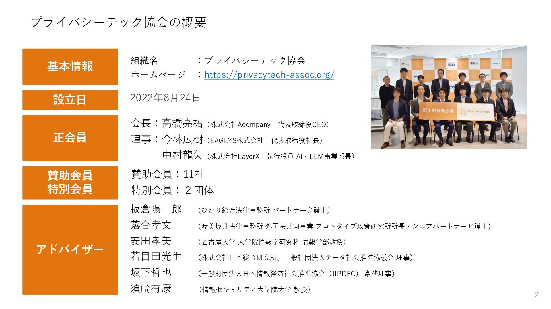 AI・LLM事業部長) 正会員 組織名 :プライバシーテック協会 ホームページ :https://privacytech-assoc.org/ 基本情報 アドバイザー 賛助会員 特別会員 賛助会員:11社 特別会員:2団体 板倉陽一郎 (ひかり総合法律事務所 パートナー弁護士) 落合孝文 (渥美坂井法律事務所 外国法共同事業 プロトタイプ政策研究所所長・シニアパートナー弁護士) 安田孝美 (名古屋大学 大学院情報学研究科 情報学部教授) 若目田光生 (株式会社日本総合研究所、一般社団法人データ社会推進協議会 理事) 坂下哲也 (一般財団法人日本情報経済社会推進協会(JIPDEC) 常務理事) 須崎有康 (情報セキュリティ大学院大学 教授)