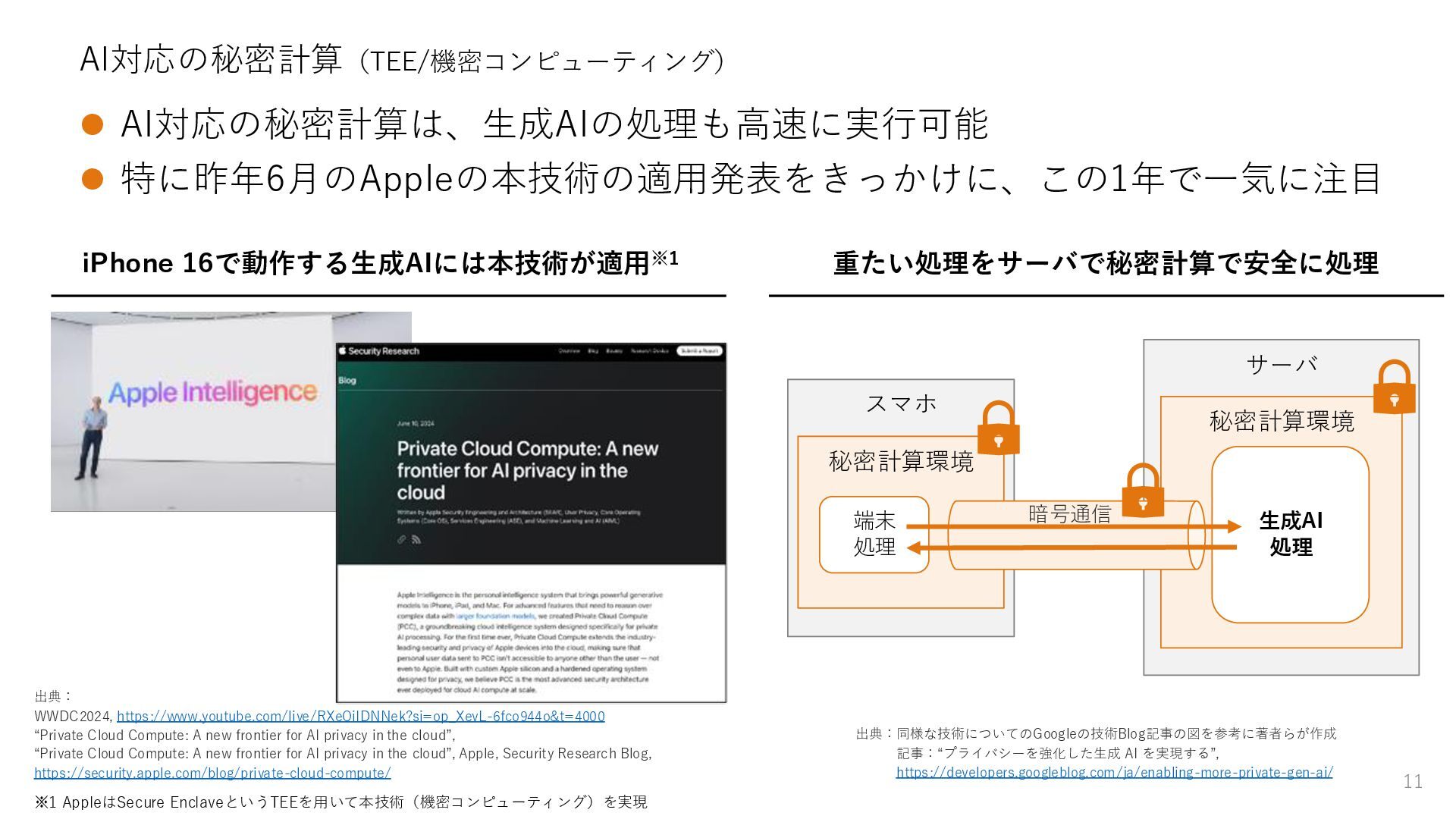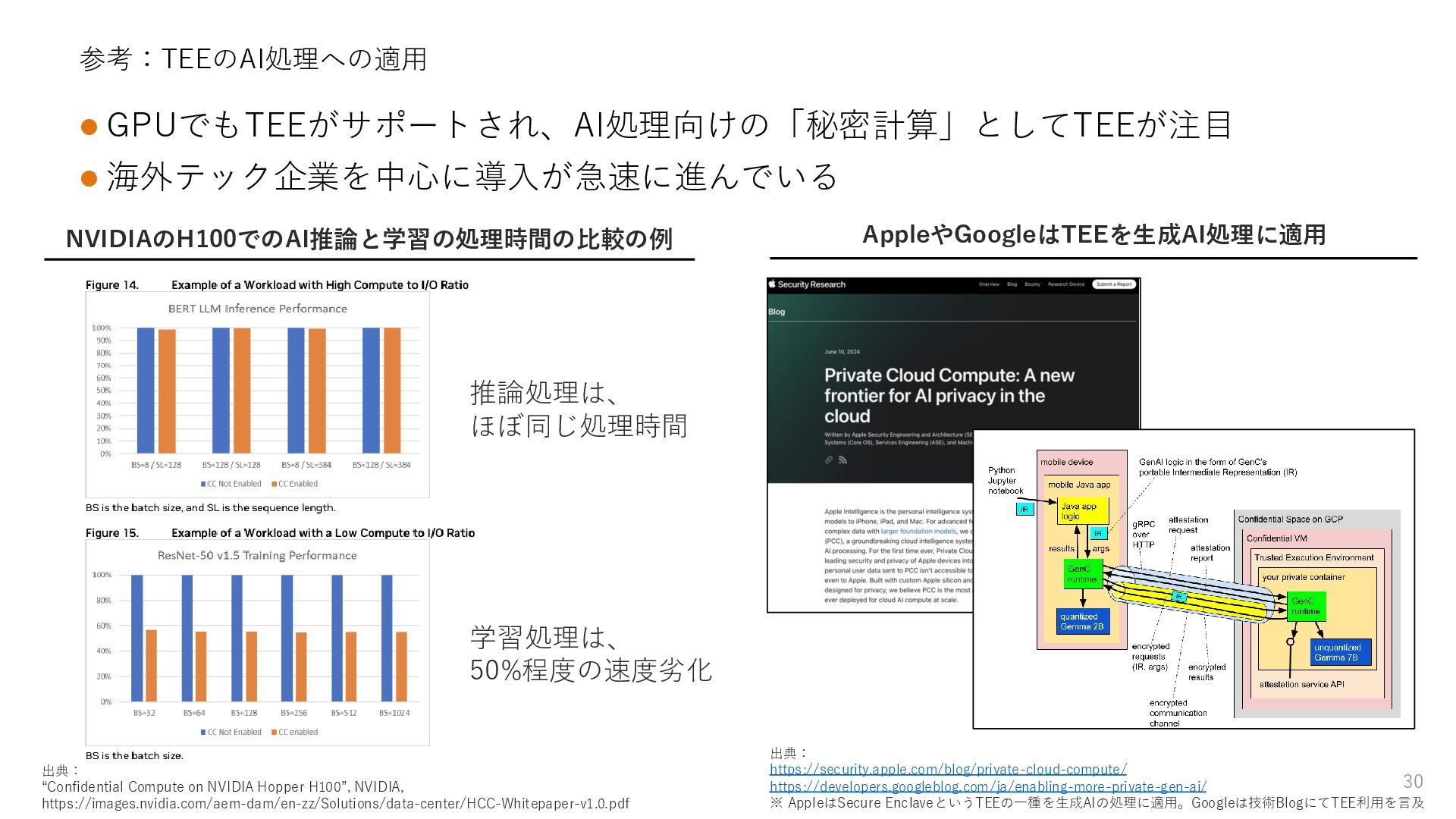 Hopper H100”, NVIDIA, https://images.nvidia.com/aem-dam/en-zz/Solutions/data-center/HCC-Whitepaper-v1.0.pdf 推論処理は、 ほぼ同じ処理時間 学習処理は、 50%程度の速度劣化 NVIDIAのH100でのAI推論と学習の処理時間の比較の例 AppleやGoogleはTEEを生成AI処理に適用 出典: https://security.apple.com/blog/private-cloud-compute/ https://developers.googleblog.com/ja/enabling-more-private-gen-ai/ ※ AppleはSecure EnclaveというTEEの一種を生成AIの処理に適用。Googleは技術BlogにてTEE利用を言及 30