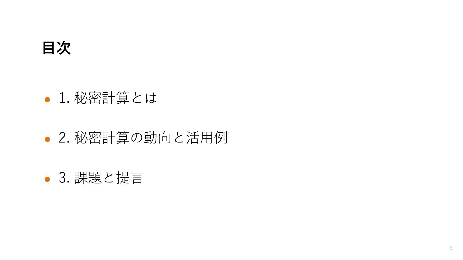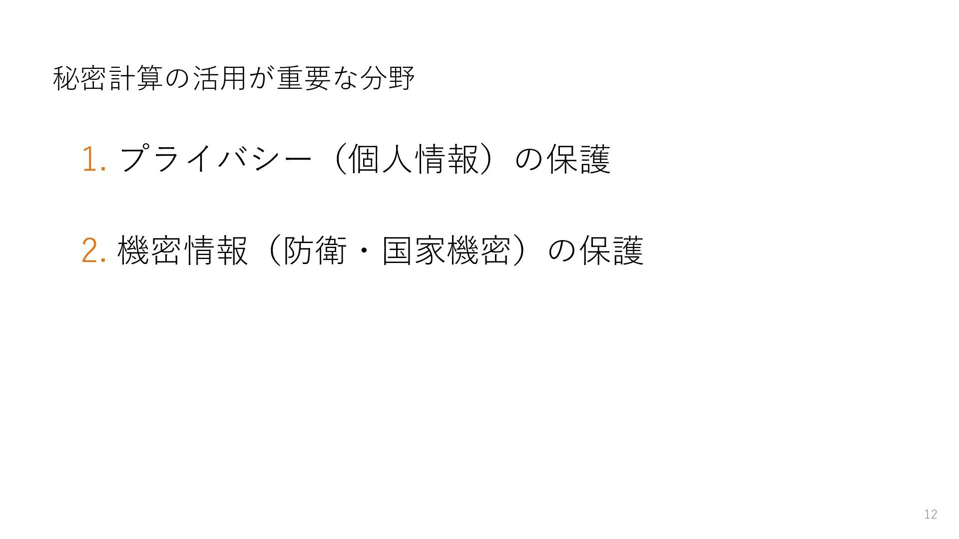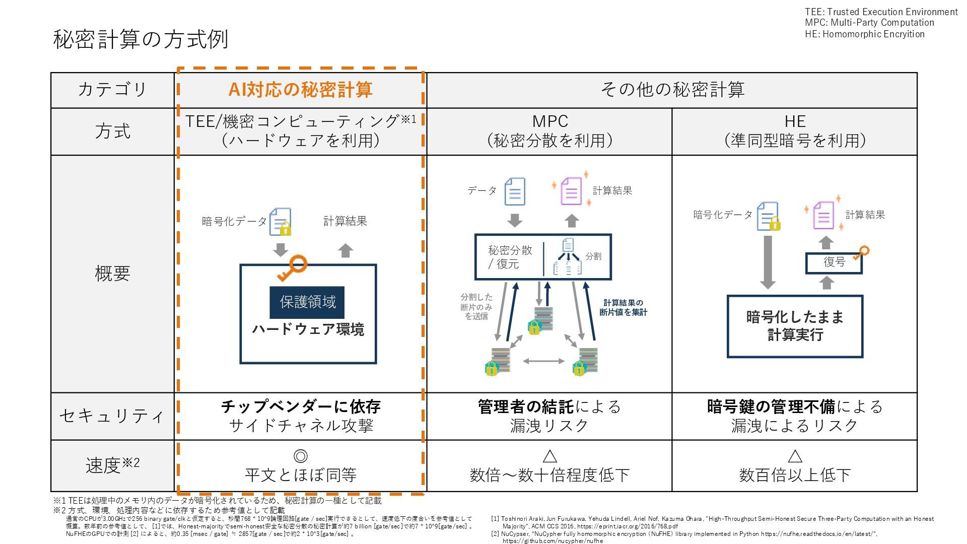 概要 セキュリティ チップベンダーに依存 サイドチャネル攻撃 管理者の結託による 漏洩リスク 暗号鍵の管理不備による 漏洩によるリスク 速度※2 ◎ 平文とほぼ同等 △ 数倍〜数十倍程度低下 △ 数百倍以上低下 ※1 TEEは処理中のメモリ内のデータが暗号化されているため、秘密計算の一種として記載 ※2 方式、環境、処理内容などに依存するため参考値として記載 秘密計算の方式例 通常のCPUが3.00GHzで256 binary gate/clkと仮定すると、秒間768 * 10^9論理回路[gate / sec]実行できるとして、速度低下の度合いを参考値として 概算。数年前の参考値として、 [1]では、Honest-majorityでsemi-honest安全な秘密分散の秘密計算が約7 billion [gate/sec]で約7 * 10^9[gate/sec] 。 NuFHEのGPUでの計測 [2] によると、約0.35 [msec / gate] ≒ 2857[gate / sec]で約2 * 10^3[gate/sec] 。 [1] Toshinori Araki, Jun Furukawa, Yehuda Lindell, Ariel Nof, Kazuma Ohara, "High-Throughput Semi-Honest Secure Three-Party Computation with an Honest Majority", ACM CCS 2016, https://eprint.iacr.org/2016/768.pdf [2] NuCypser, “NuCypher fully homomorphic encryption (NuFHE) library implemented in Python https://nufhe.readthedocs.io/en/latest/”, https://github.com/nucypher/nufhe 計算結果 暗号化データ 保護領域 ハードウェア環境 計算結果 データ 分割した 断片のみ を送信 計算結果の 断片値を集計 秘密分散 / 復元 分割 計算結果 暗号化データ 暗号化したまま 計算実行 復号 TEE: Trusted Execution Environment MPC: Multi-Party Computation HE: Homomorphic Encryition