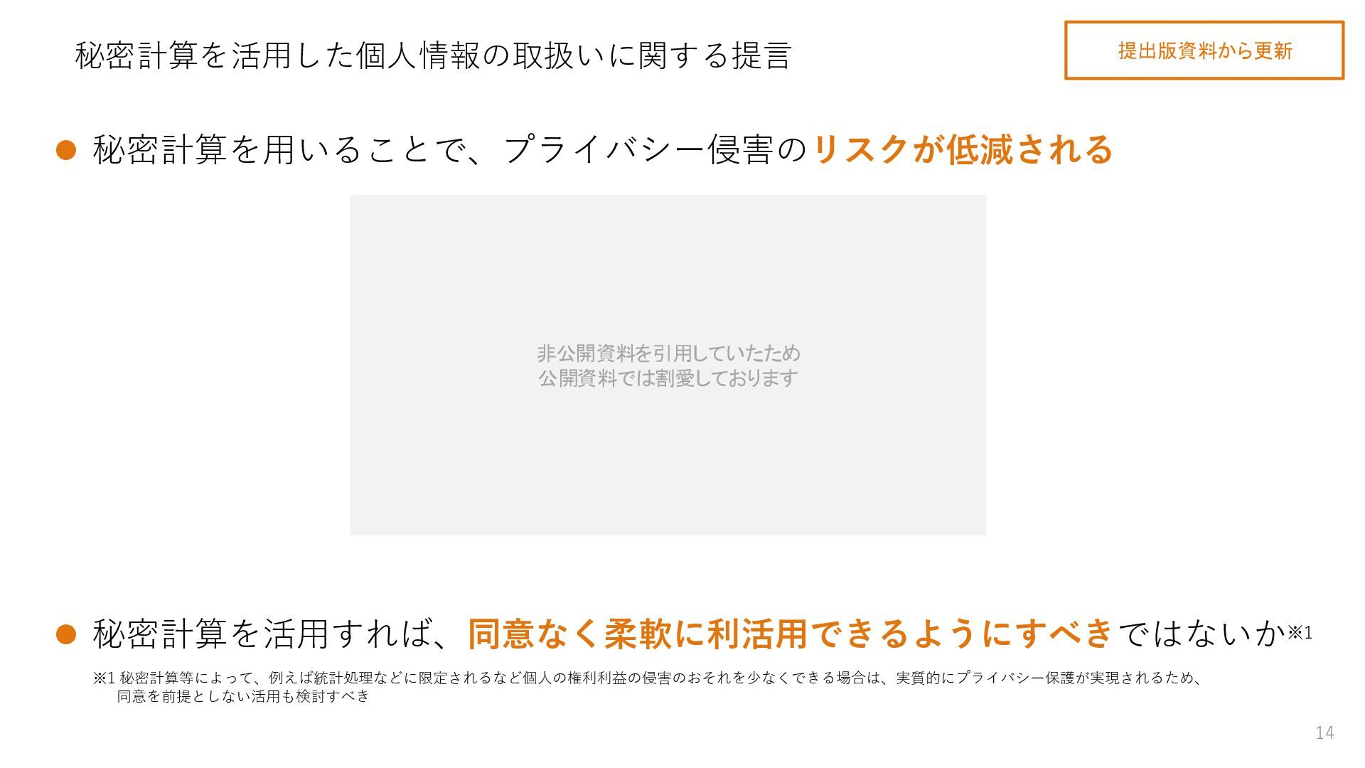 12. まとめ・提案 ◼ 提言1:PETs(秘密計算等)を用いて実質的にプライバシー保護を図る場合には、 同意なく柔軟な活用ができる制度にすべき※1 • 秘密計算等を活用すれば同意なしで個人情報の第三者提供、企業間連携が行なえる など※1 ◼ 提言2:安全保障に関わる重要情報は秘密計算で保護するべき •