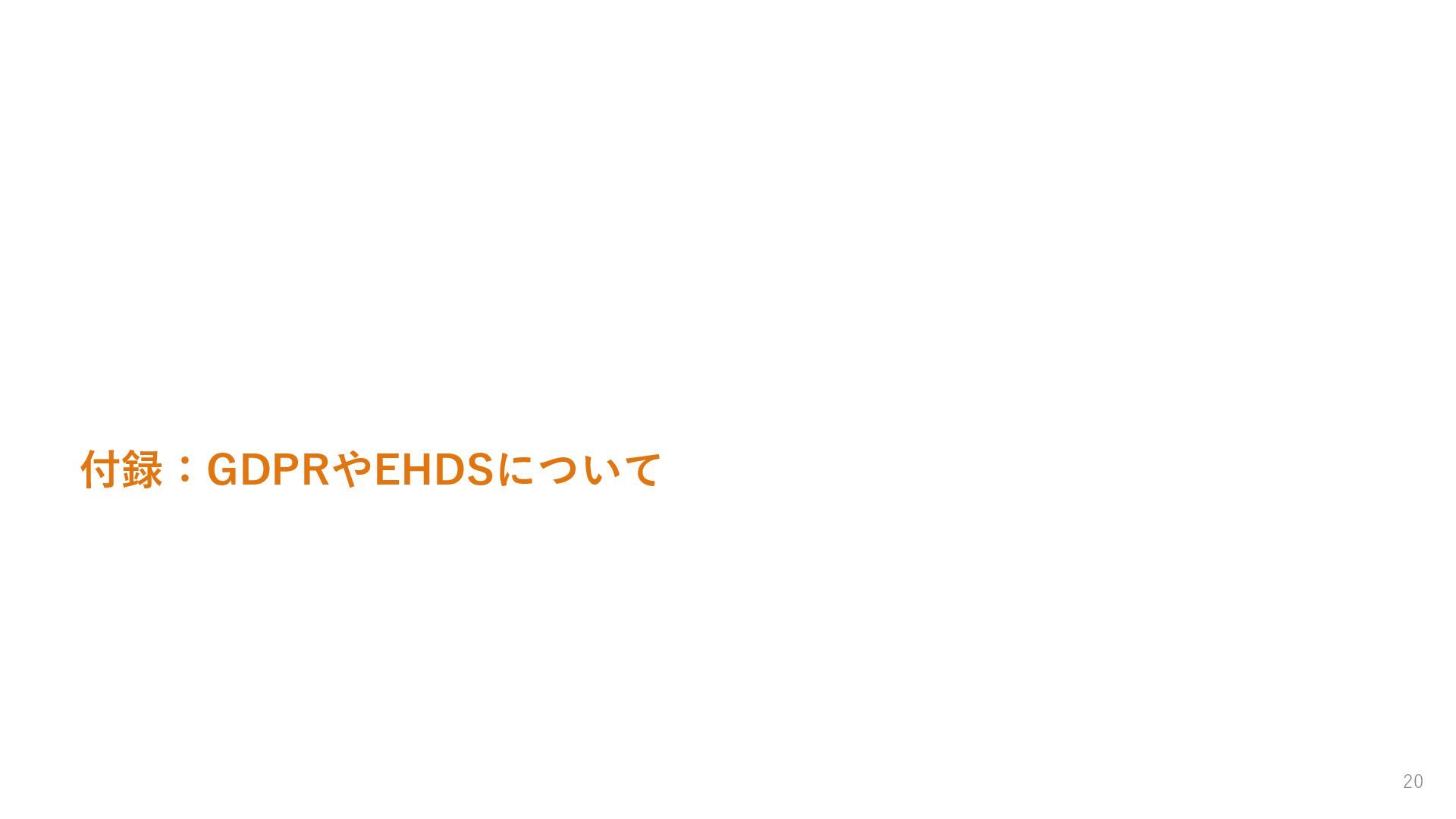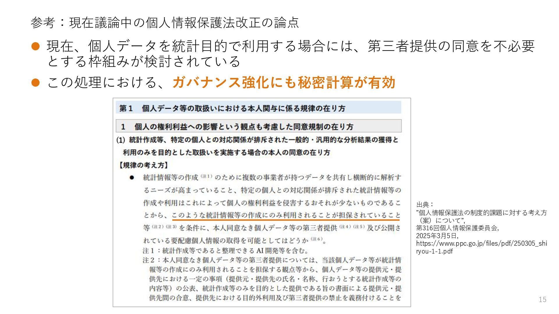 処方履歴 氏名 運動量 計測値 医療機関A 電子カルテ ヘルスケア事業者B 運動量データ 氏名 傷病名 処方履歴 運動量 計測値 統合データ AIモデル (統計情報) 例:運動量と疾病の相関や 傾向を分析 (運動量がX以上であると、 Y疾病になりにくい) 秘密計算を応用した技術で、この処理を秘匿化 (≒誰も処理途中の生データを閲覧・個人特定できない) ※1 秘密計算によって、統計的な処理に限定されるなど個人の権利利益の侵害のおそれを少なくできる場合は、実質的にプライバシー保護が実現されると考える