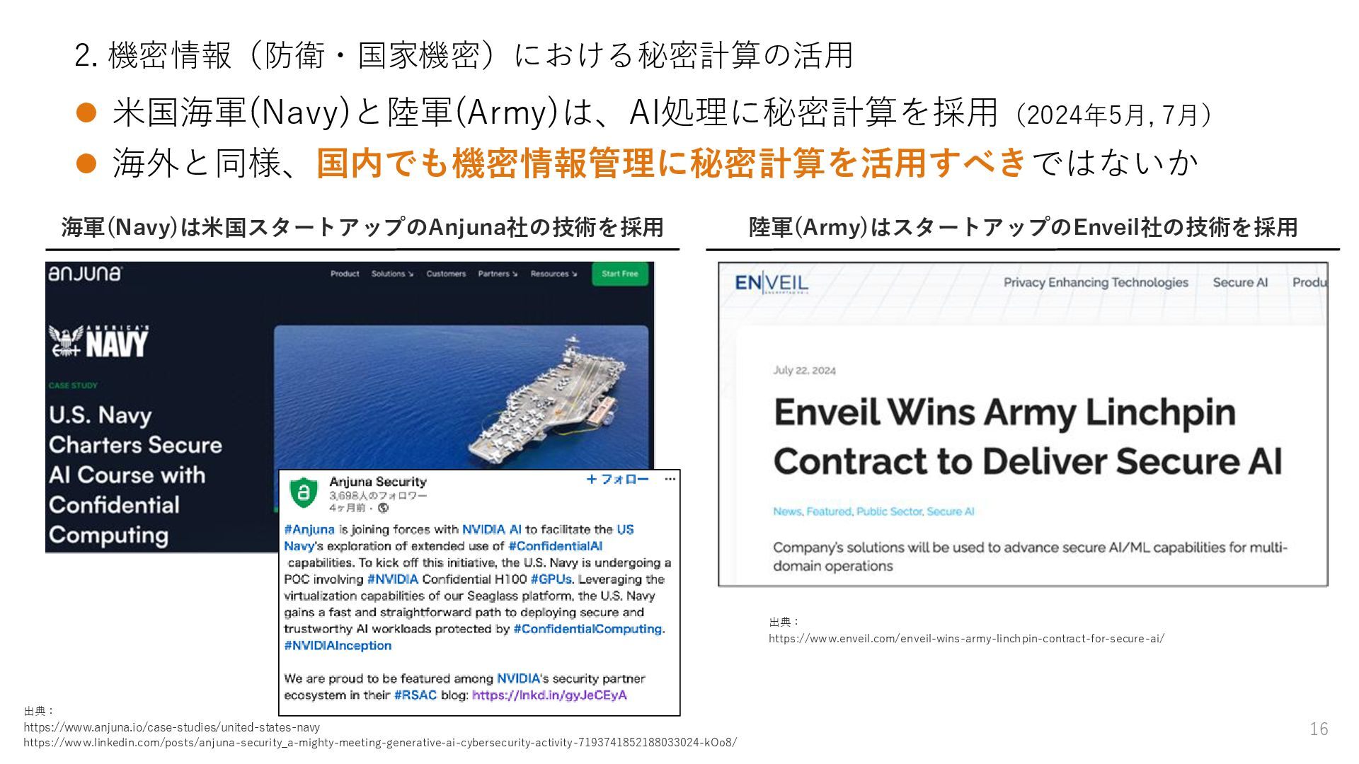 10. 2. 機密情報(防衛・国家機密)における秘密計算の活用 ⚫ 米国海軍(Navy)と陸軍(Army)は、AI処理に秘密計算を採用(2024年5月, 7月) ⚫ 海外と同様、国内でも機密情報管理に秘密計算を活用すべきではないか 16 出典: https://www.anjuna.io/case-studies/united-states-navy
