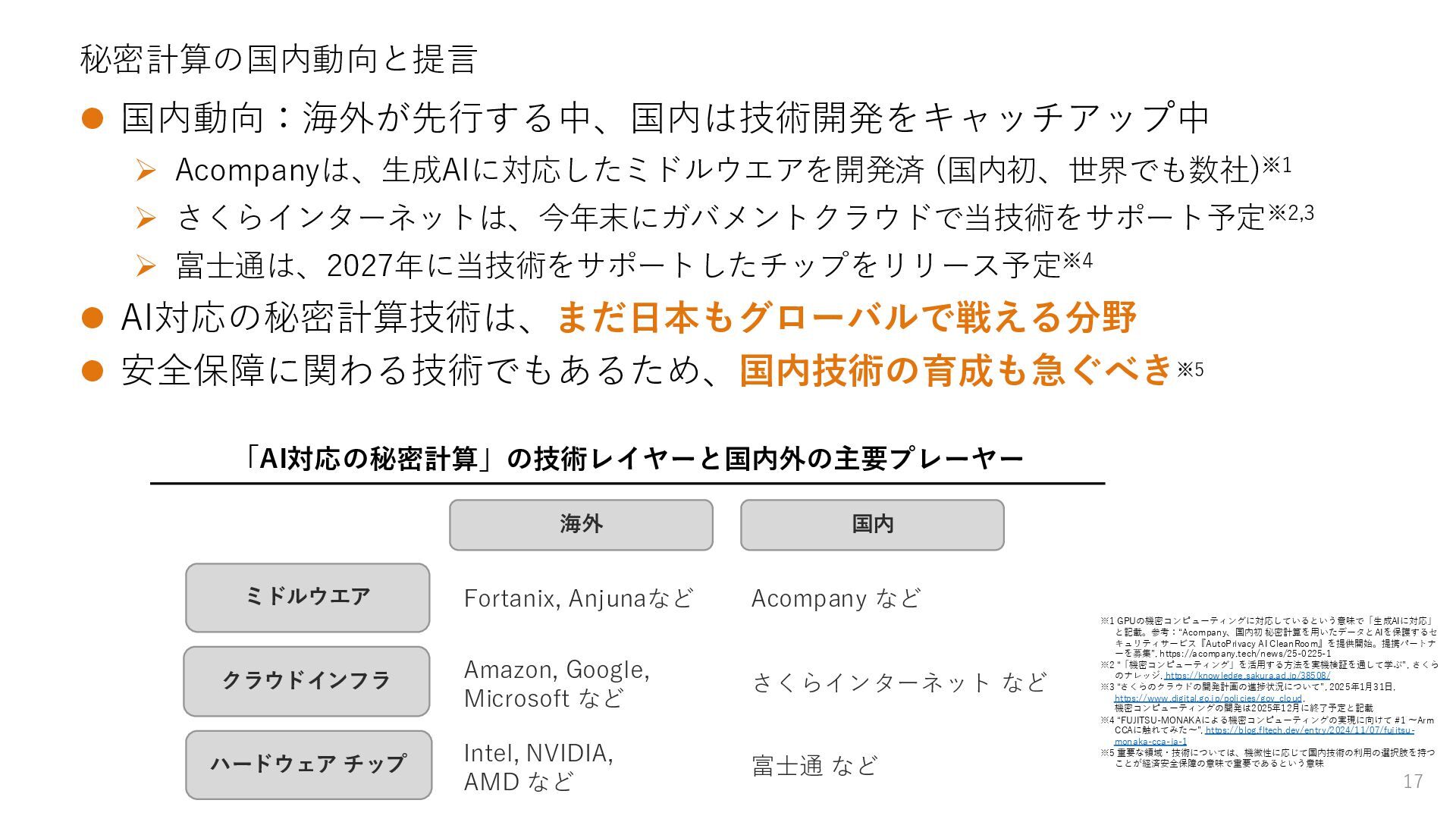 ⚫ AI対応の秘密計算技術は、まだ日本もグローバルで戦える分野 ⚫ 安全保障に関わる技術でもあるため、国内技術の育成も急ぐべき※5 17 ※1 GPUの機密コンピューティングに対応しているという意味で「生成AIに対応」 と記載。参考:“Acompany、国内初 秘密計算を用いたデータとAIを保護するセ キュリティサービス『AutoPrivacy AI CleanRoom』を提供開始。提携パートナ ーを募集”, https://acompany.tech/news/25-0225-1 ※2 “「機密コンピューティング」を活用する方法を実機検証を通して学ぶ”, さくら のナレッジ, https://knowledge.sakura.ad.jp/38508/ ※3 “さくらのクラウドの開発計画の進捗状況について”, 2025年1月31日, https://www.digital.go.jp/policies/gov_cloud, 機密コンピューティングの開発は2025年12月に終了予定と記載 ※4 “FUJITSU-MONAKAによる機密コンピューティングの実現に向けて #1 〜Arm CCAに触れてみた〜”, https://blog.fltech.dev/entry/2024/11/07/fujitsu- monaka-cca-ja-1 ※5 重要な領域・技術については、機微性に応じて国内技術の利用の選択肢を持つ ことが経済安全保障の意味で重要であるという意味 海外 富士通 など Acompany など ミドルウエア ハードウェア チップ Intel, NVIDIA, AMD など Fortanix, Anjunaなど 国内 さくらインターネット など クラウドインフラ Amazon, Google, Microsoft など 「AI対応の秘密計算」の技術レイヤーと国内外の主要プレーヤー