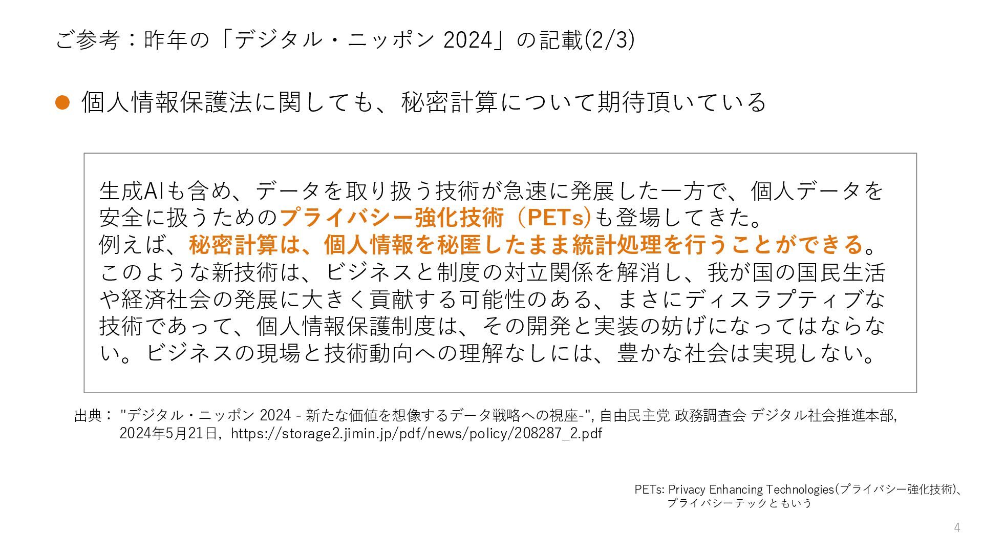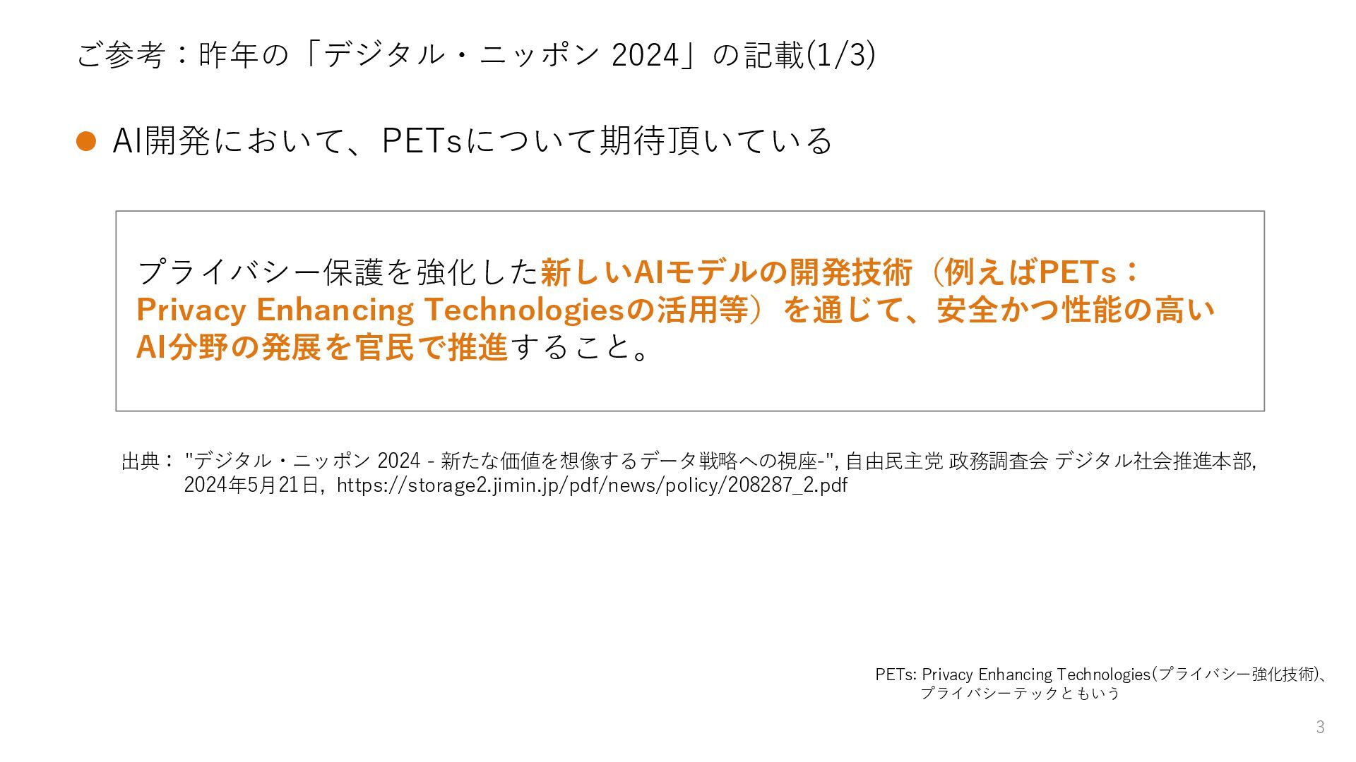 自由民主党 政務調査会 デジタル社会推進本部, 2024年5月21日, https://storage2.jimin.jp/pdf/news/policy/208287_2.pdf PETs: Privacy Enhancing Technologies(プライバシー強化技術)、 プライバシーテックともいう プライバシー保護を強化した新しいAIモデルの開発技術(例えばPETs: Privacy Enhancing Technologiesの活用等)を通じて、安全かつ性能の高い AI分野の発展を官民で推進すること。