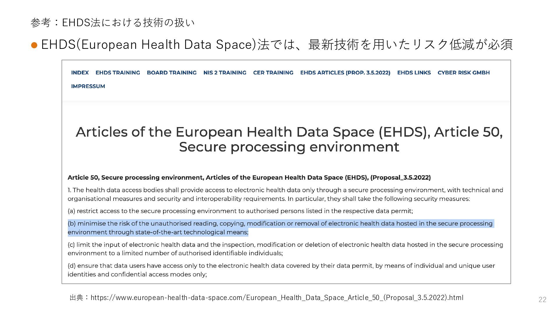 21. 参考:出力が統計情報となることの技術的な担保方法 ⚫ 例えば、秘密計算の一例であるTEEには、事前登録されている処理プログラムが確実に実行されているこ とを確認する機能※3が存在 ⚫ この機能を用いて、統計情報であるかをチェックするプログラムが実行されていることを確認することで、 統計情報のみが出力されることを担保可能(統計情報に該当する情報の出力を抑制可能) ⚫ さらに、分析に用いたデータを復号することなく処理後に確実に削除することで、過度にデータが蓄積・ 統合されることを防ぎ、プライバシーリスクの低減につながる