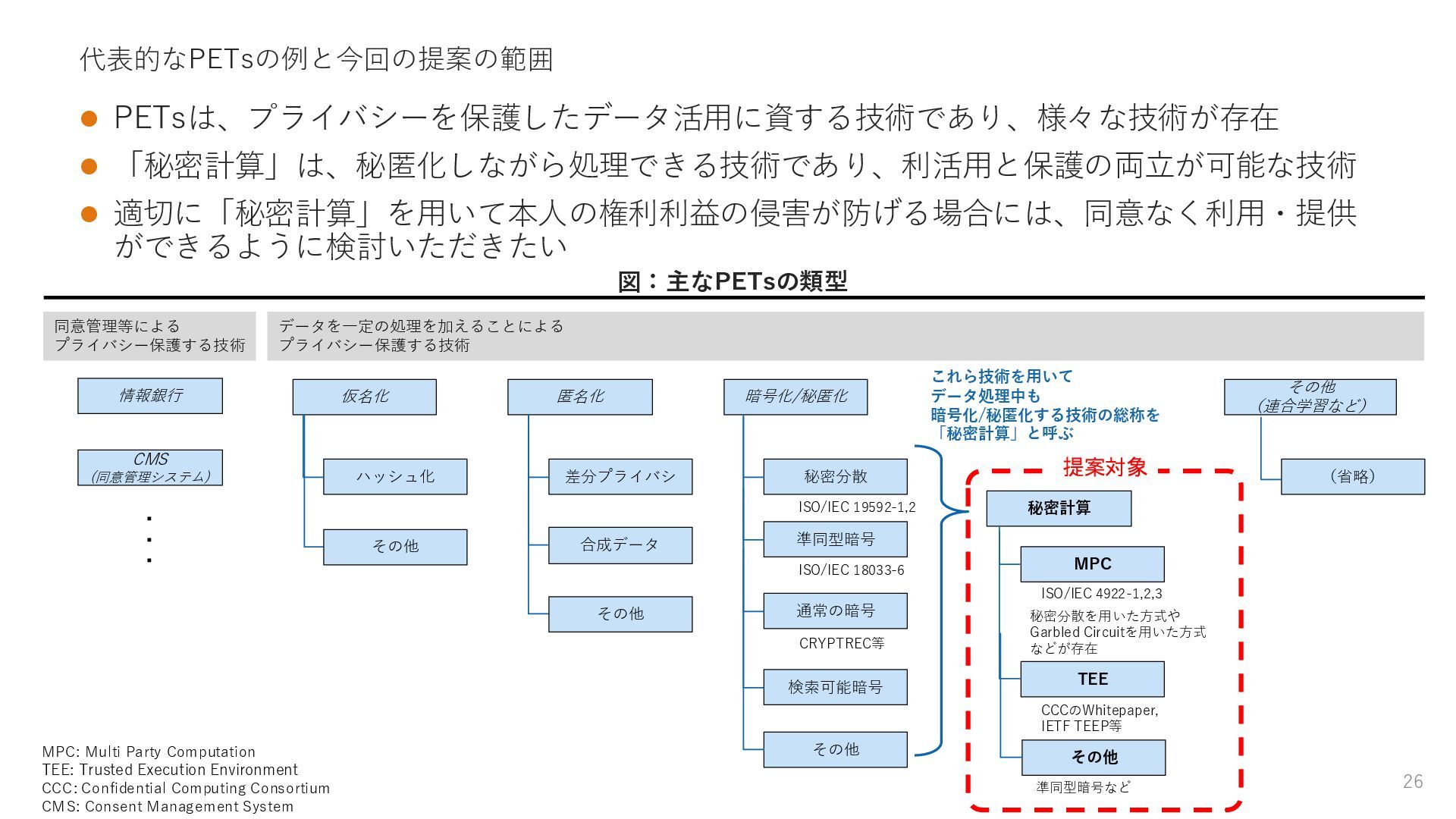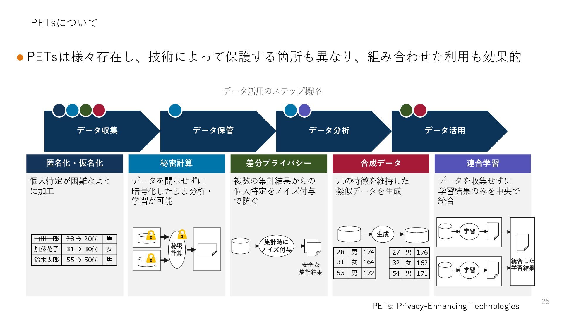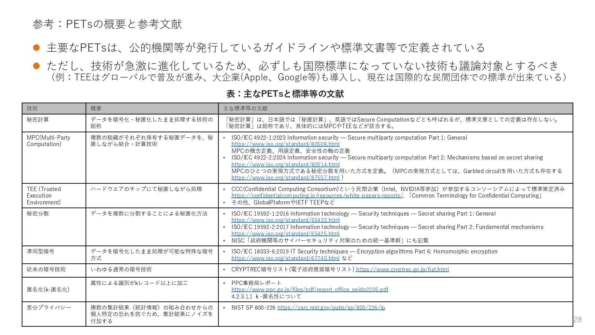 自由民主党 政務調査会 デジタル社会推進本部, 2024年5月21日, https://storage2.jimin.jp/pdf/news/policy/208287_2.pdf 生成AIも含め、データを取り扱う技術が急速に発展した一方で、個人データを 安全に扱うためのプライバシー強化技術(PETs)も登場してきた。 例えば、秘密計算は、個人情報を秘匿したまま統計処理を行うことができる。 このような新技術は、ビジネスと制度の対立関係を解消し、我が国の国民生活 や経済社会の発展に大きく貢献する可能性のある、まさにディスラプティブな 技術であって、個人情報保護制度は、その開発と実装の妨げになってはならな い。ビジネスの現場と技術動向への理解なしには、豊かな社会は実現しない。 PETs: Privacy Enhancing Technologies(プライバシー強化技術)、 プライバシーテックともいう