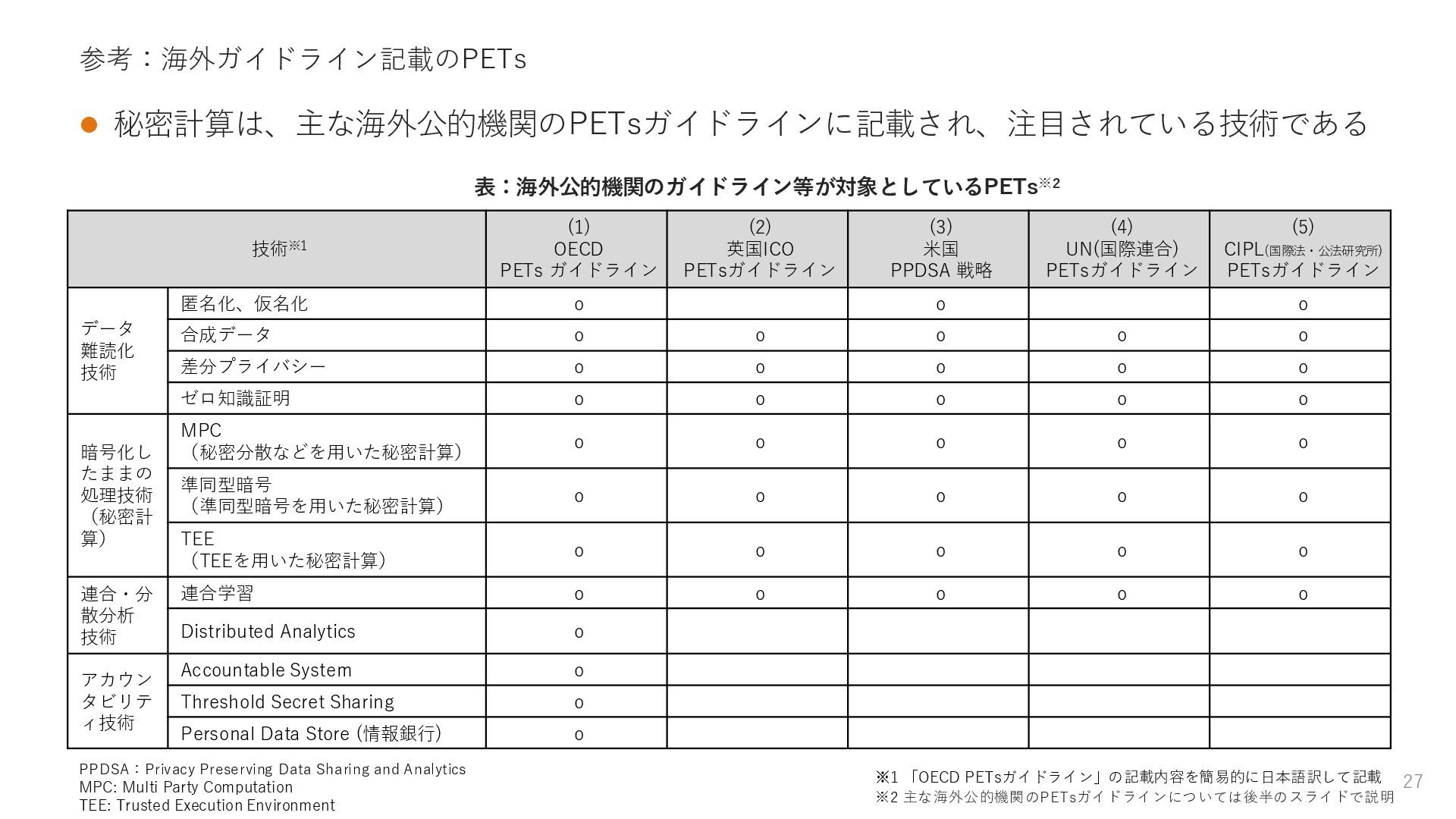 (2) 英国ICO PETsガイドライン (3) 米国 PPDSA 戦略 (4) UN(国際連合) PETsガイドライン (5) CIPL(国際法・公法研究所) PETsガイドライン データ 難読化 技術 匿名化、仮名化 o o o 合成データ o o o o o 差分プライバシー o o o o o ゼロ知識証明 o o o o o 暗号化し たままの 処理技術 (秘密計 算) MPC (秘密分散などを用いた秘密計算) o o o o o 準同型暗号 (準同型暗号を用いた秘密計算) o o o o o TEE (TEEを用いた秘密計算) o o o o o 連合・分 散分析 技術 連合学習 o o o o o Distributed Analytics o アカウン タビリテ ィ技術 Accountable System o Threshold Secret Sharing o Personal Data Store (情報銀行) o PPDSA:Privacy Preserving Data Sharing and Analytics MPC: Multi Party Computation TEE: Trusted Execution Environment ※1 「OECD PETsガイドライン」の記載内容を簡易的に日本語訳して記載 ※2 主な海外公的機関のPETsガイドラインについては後半のスライドで説明