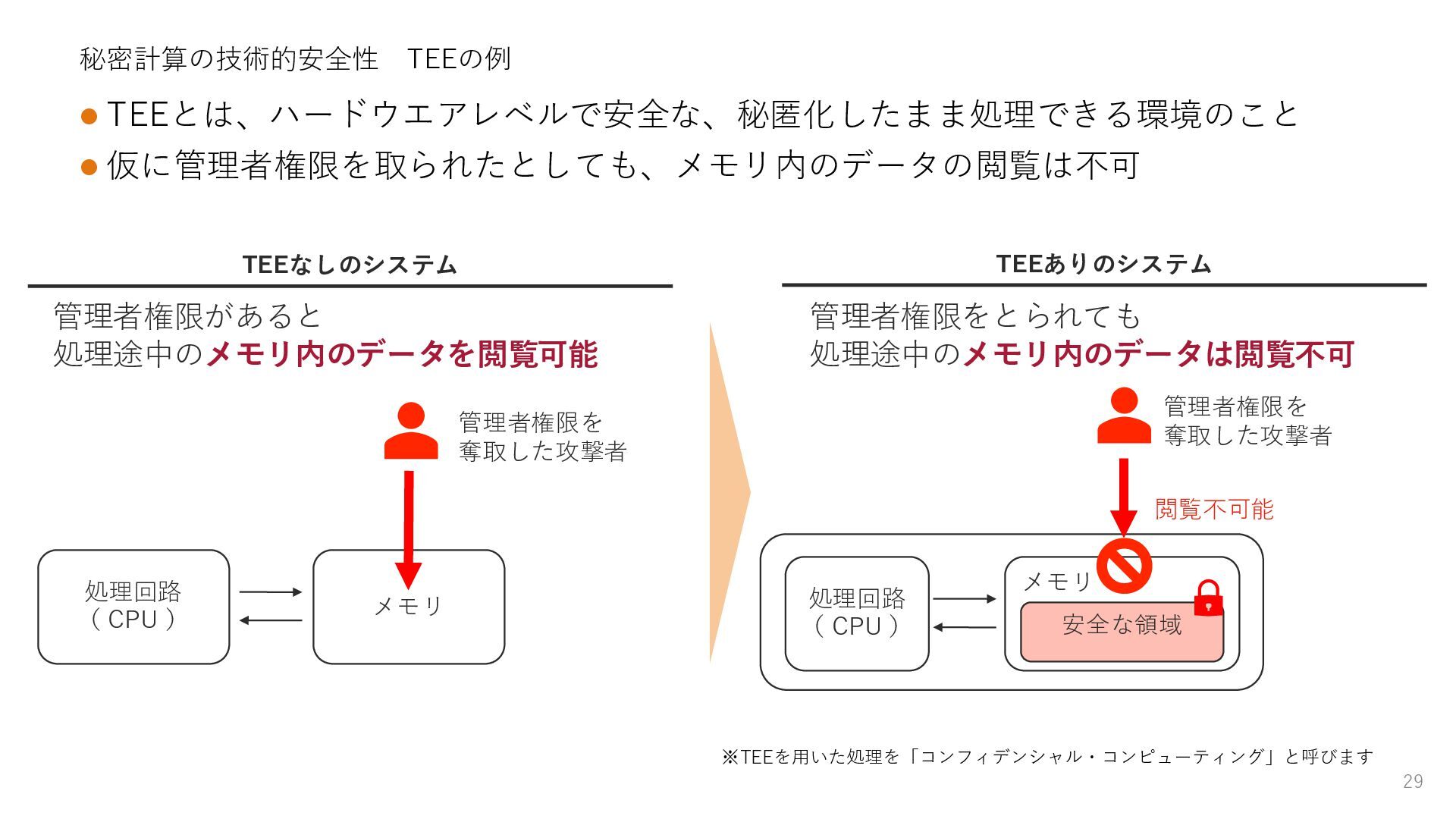 メモリ 管理者権限を 奪取した攻撃者 管理者権限があると 処理途中のメモリ内のデータを閲覧可能 管理者権限を 奪取した攻撃者 閲覧不可能 処理回路 ( CPU ) メモリ 安全な領域 管理者権限をとられても 処理途中のメモリ内のデータは閲覧不可 TEEなしのシステム TEEありのシステム 29 ※TEEを用いた処理を「コンフィデンシャル・コンピューティング」と呼びます