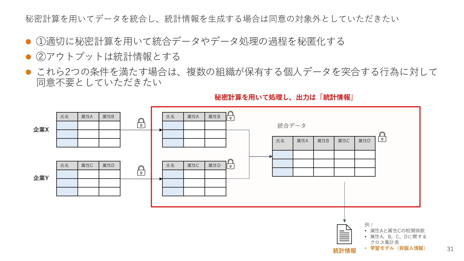 属性D 氏名 属性A 属性B 氏名 属性C 属性D 氏名 属性A 属性B 統計情報 例: • 属性Aと属性Cの相関係数 • 属性A,B、C、Dに関する クロス集計表 • 学習モデル(非個人情報) 企業X 企業Y 秘密計算を用いて処理し、出力は「統計情報」 ⚫ ①適切に秘密計算を用いて統合データやデータ処理の過程を秘匿化する ⚫ ②アウトプットは統計情報とする ⚫ これら2つの条件を満たす場合は、複数の組織が保有する個人データを突合する行為に対して 同意不要としていただきたい
