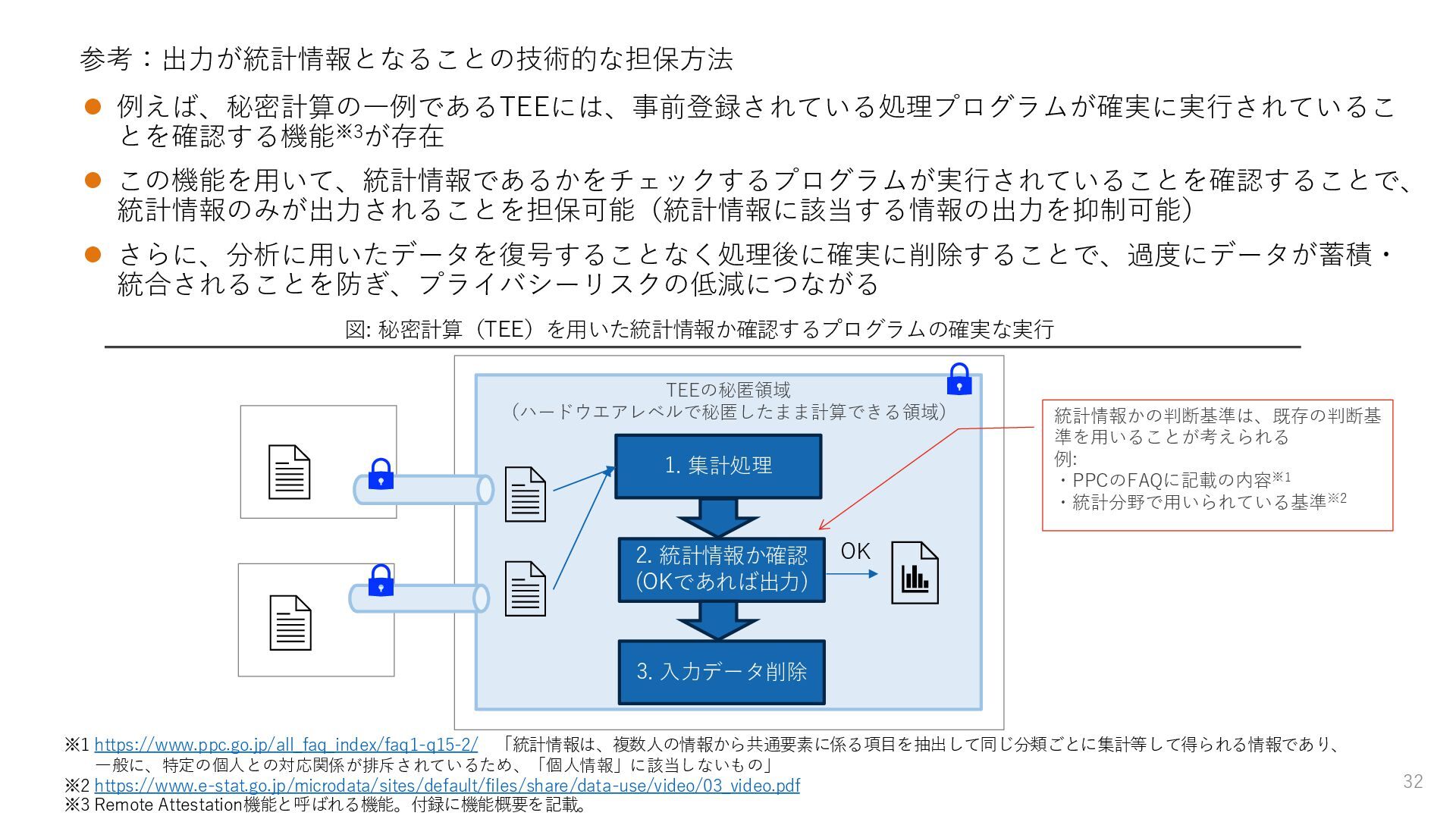 32 TEEの秘匿領域 (ハードウエアレベルで秘匿したまま計算できる領域) 図: 秘密計算(TEE)を用いた統計情報か確認するプログラムの確実な実行 1. 集計処理 2. 統計情報か確認 (OKであれば出力) OK 統計情報かの判断基準は、既存の判断基 準を用いることが考えられる 例: ・PPCのFAQに記載の内容※1 ・統計分野で用いられている基準※2 ※1 https://www.ppc.go.jp/all_faq_index/faq1-q15-2/ 「統計情報は、複数人の情報から共通要素に係る項目を抽出して同じ分類ごとに集計等して得られる情報であり、 一般に、特定の個人との対応関係が排斥されているため、「個人情報」に該当しないもの」 ※2 https://www.e-stat.go.jp/microdata/sites/default/files/share/data-use/video/03_video.pdf ※3 Remote Attestation機能と呼ばれる機能。付録に機能概要を記載。 3. 入力データ削除