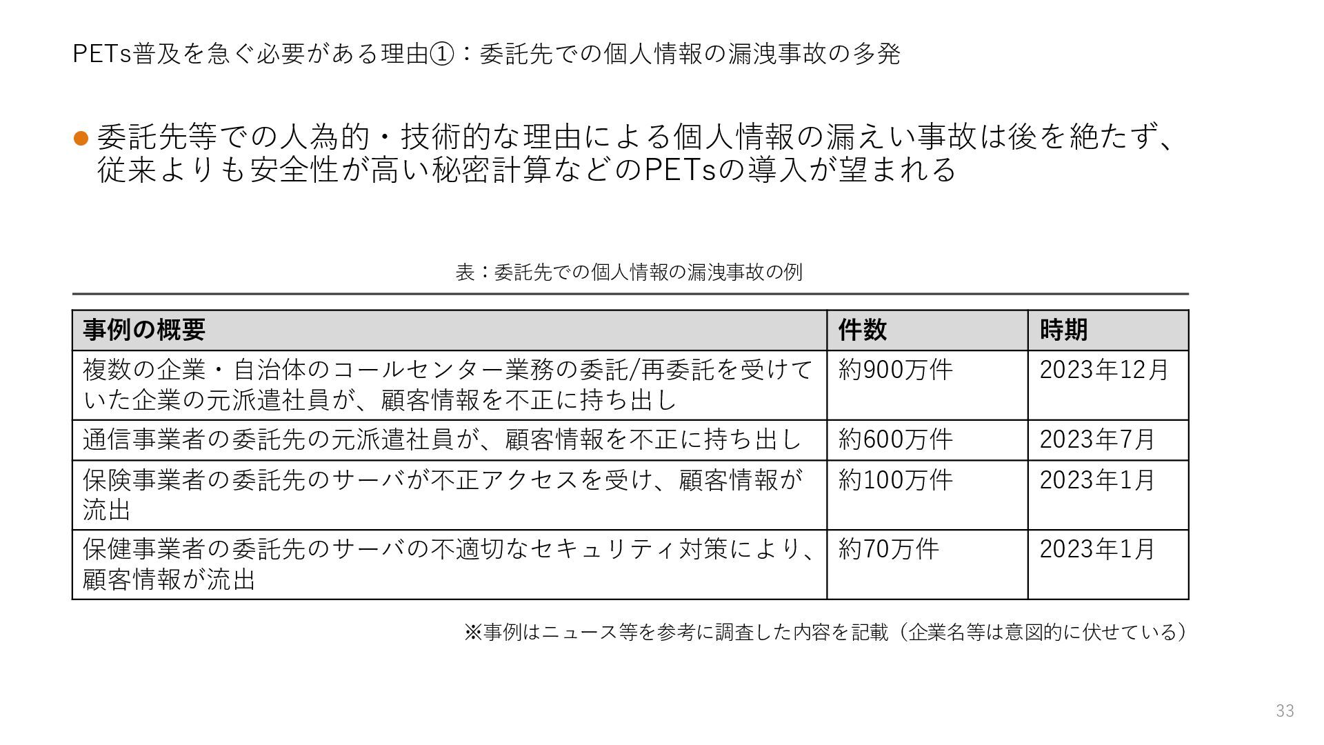 22. PETs普及を急ぐ必要がある理由①:委託先での個人情報の漏洩事故の多発 ⚫ 委託先等での人為的・技術的な理由による個人情報の漏えい事故は後を絶たず、 従来よりも安全性が高い秘密計算などのPETsの導入が望まれる 33 事例の概要 件数 時期 複数の企業・自治体のコールセンター業務の委託/再委託を受けて いた企業の元派遣社員が、顧客情報を不正に持ち出し