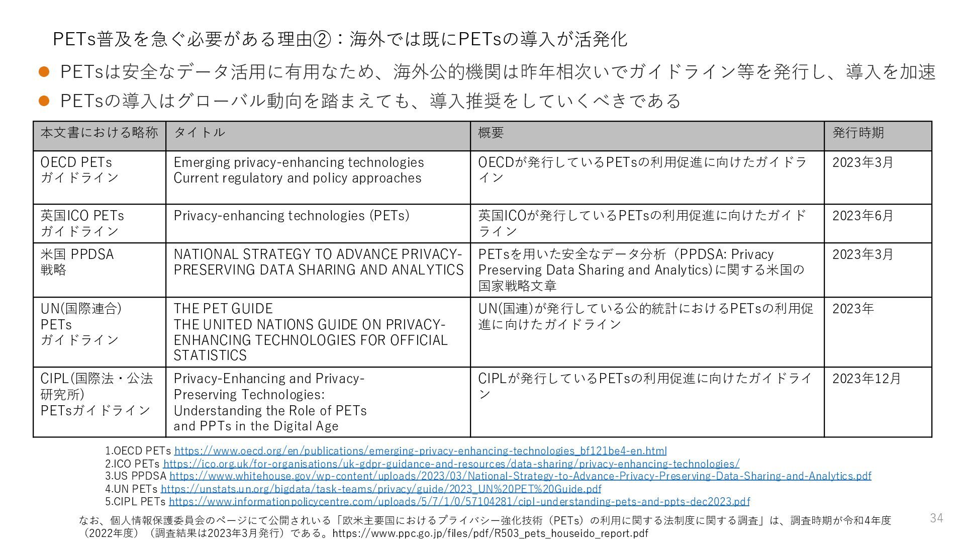 privacy-enhancing technologies Current regulatory and policy approaches OECDが発行しているPETsの利用促進に向けたガイドラ イン 2023年3月 英国ICO PETs ガイドライン Privacy-enhancing technologies (PETs) 英国ICOが発行しているPETsの利用促進に向けたガイド ライン 2023年6月 米国 PPDSA 戦略 NATIONAL STRATEGY TO ADVANCE PRIVACY- PRESERVING DATA SHARING AND ANALYTICS PETsを用いた安全なデータ分析(PPDSA: Privacy Preserving Data Sharing and Analytics)に関する米国の 国家戦略文章 2023年3月 UN(国際連合) PETs ガイドライン THE PET GUIDE THE UNITED NATIONS GUIDE ON PRIVACY- ENHANCING TECHNOLOGIES FOR OFFICIAL STATISTICS UN(国連)が発行している公的統計におけるPETsの利用促 進に向けたガイドライン 2023年 CIPL(国際法・公法 研究所) PETsガイドライン Privacy-Enhancing and Privacy- Preserving Technologies: Understanding the Role of PETs and PPTs in the Digital Age CIPLが発行しているPETsの利用促進に向けたガイドライ ン 2023年12月 1.OECD PETs https://www.oecd.org/en/publications/emerging-privacy-enhancing-technologies_bf121be4-en.html 2.ICO PETs https://ico.org.uk/for-organisations/uk-gdpr-guidance-and-resources/data-sharing/privacy-enhancing-technologies/ 3.US PPDSA https://www.whitehouse.gov/wp-content/uploads/2023/03/National-Strategy-to-Advance-Privacy-Preserving-Data-Sharing-and-Analytics.pdf 4.UN PETs https://unstats.un.org/bigdata/task-teams/privacy/guide/2023_UN%20PET%20Guide.pdf 5.CIPL PETs https://www.informationpolicycentre.com/uploads/5/7/1/0/57104281/cipl-understanding-pets-and-ppts-dec2023.pdf なお、個人情報保護委員会のページにて公開されいる「欧米主要国におけるプライバシー強化技術(PETs)の利用に関する法制度に関する調査」は、調査時期が令和4年度 (2022年度)(調査結果は2023年3月発行)である。https://www.ppc.go.jp/files/pdf/R503_pets_houseido_report.pdf ⚫ PETsは安全なデータ活用に有用なため、海外公的機関は昨年相次いでガイドライン等を発行し、導入を加速 ⚫ PETsの導入はグローバル動向を踏まえても、導入推奨をしていくべきである