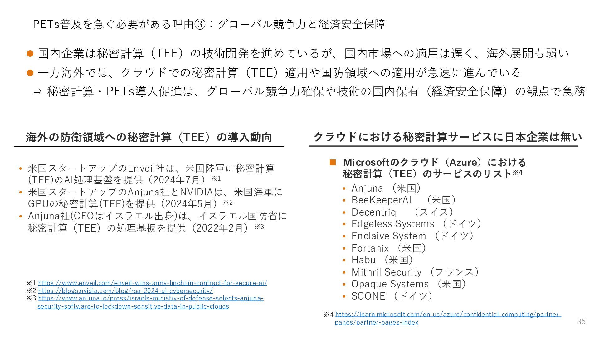 24. PETs普及を急ぐ必要がある理由③:グローバル競争力と経済安全保障 ⚫ 国内企業は秘密計算(TEE)の技術開発を進めているが、国内市場への適用は遅く、海外展開も弱い ⚫ 一方海外では、クラウドでの秘密計算(TEE)適用や国防領域への適用が急速に進んでいる ⇒ 秘密計算・PETs導入促進は、グローバル競争力確保や技術の国内保有(経済安全保障)の観点で急務 35 海外の防衛領域への秘密計算(TEE)の導入動向 クラウドにおける秘密計算サービスに日本企業は無い